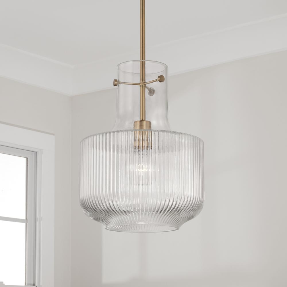 Fluted glass and a tulip silhouette create organic intrigue with the Nyla Pendant. The warmth of the Aged Brass finish reflects a sleek and stunning style.