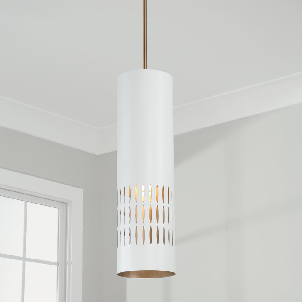 6.25"W x 21.75"H 1-Light Pendant in Aged Brass and White Metal Shade with Painted Aged Brass Interior