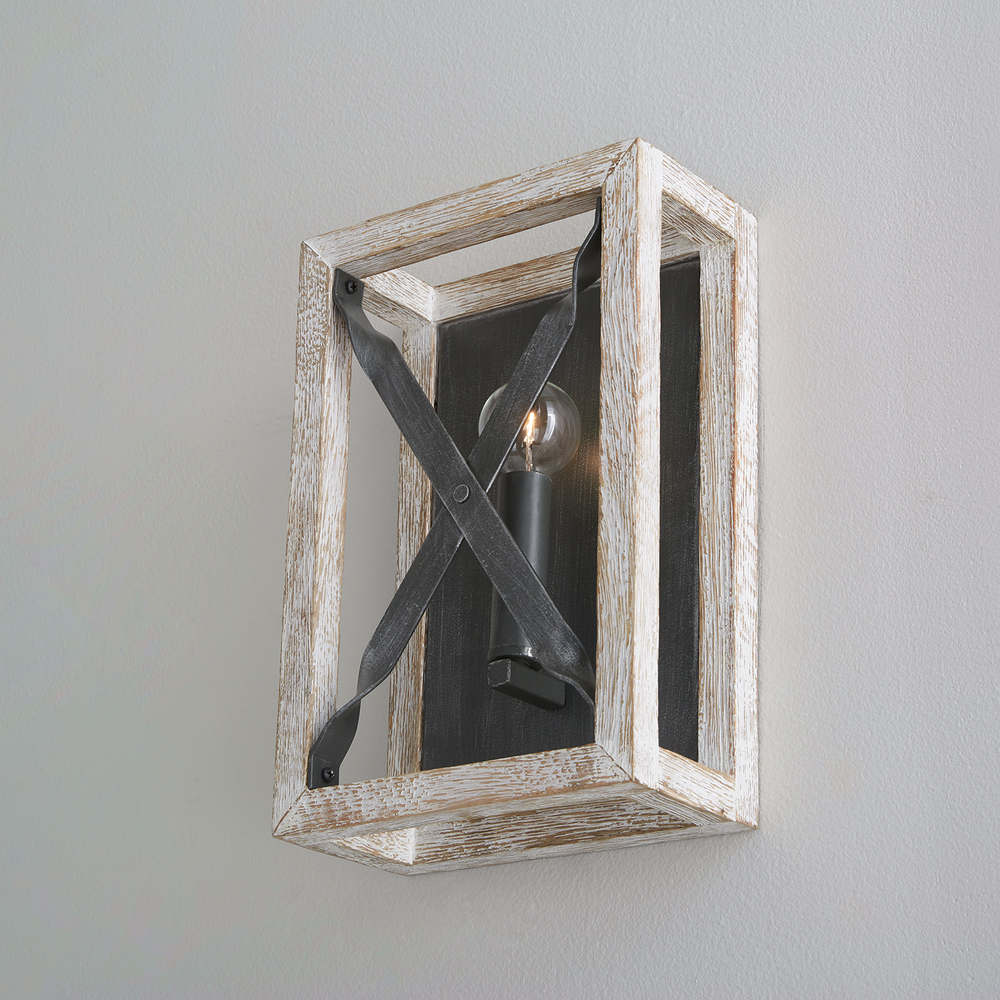 The juxtaposition of dark, visually distressed metal against white-washed, textured wood in the 1-Light Sconce brings a crisp freshness to the farmhouse trend.