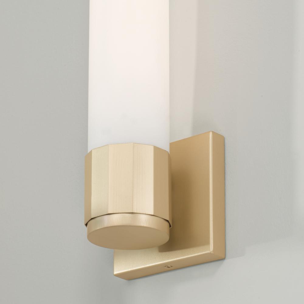 Sophisticated and stunning, the Sutton Sconce puts a tailored touch on a simple form. The champagne sheen of Soft Gold faceted band complements the frosted glass for elevated elegance.