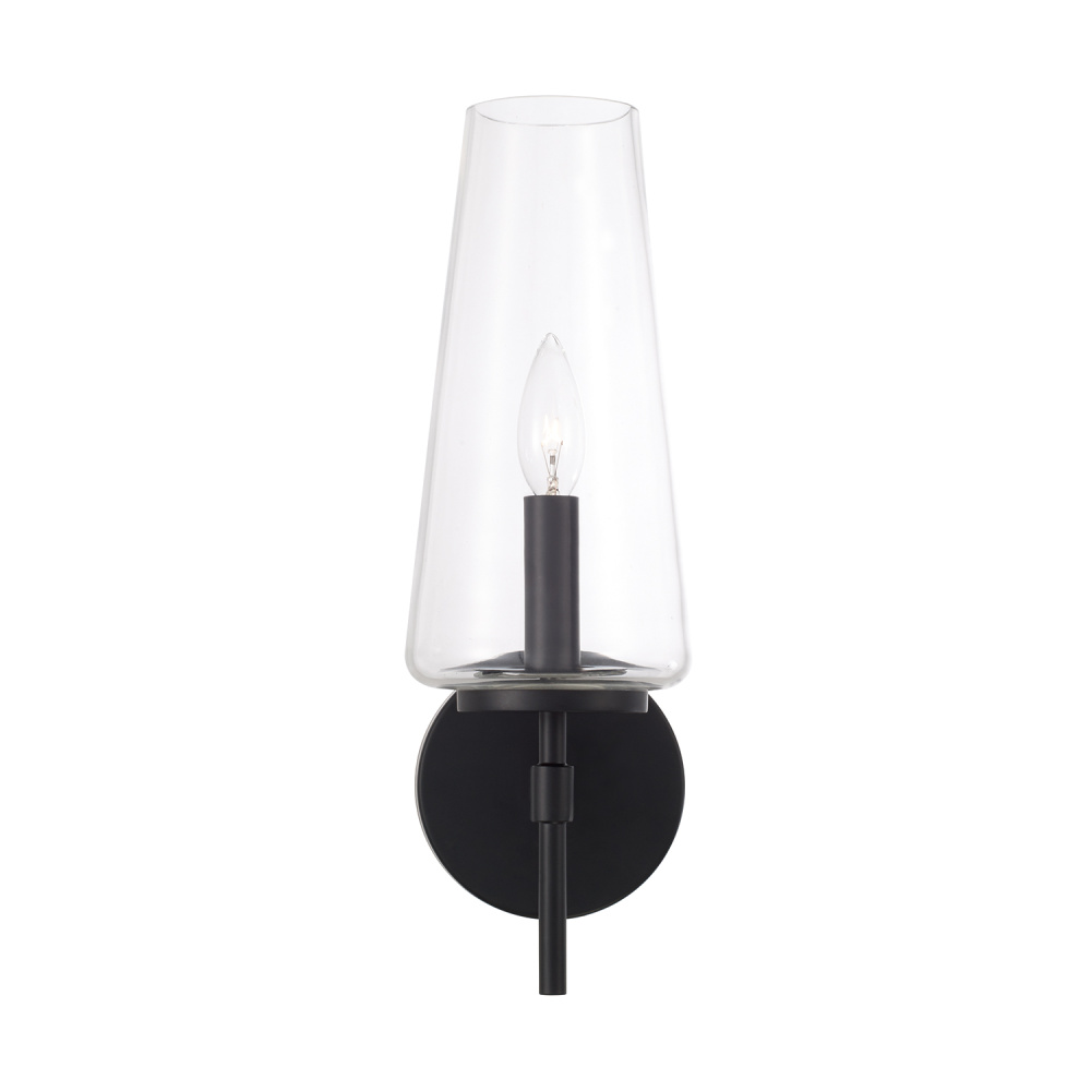 Classic style and clear glass create the Aaron 1-Light Sconce for HomePlace. The tapered cylindrical shade brings refined style with optimal light output, while the Matte Black finish punctuates the simple silhouette. Also available in Aged Brass.
