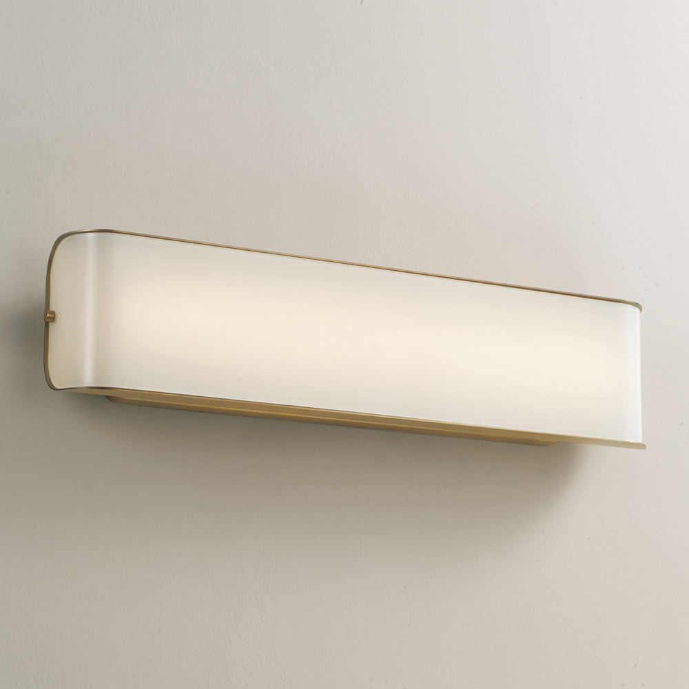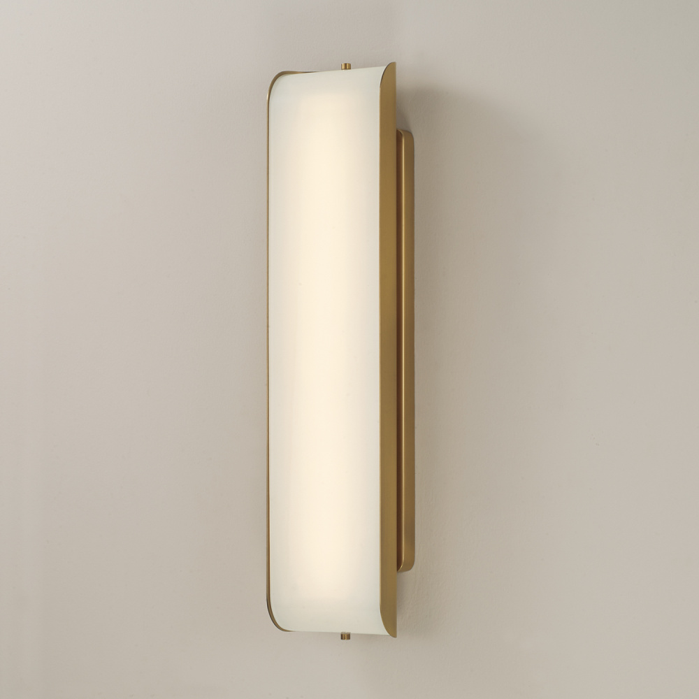 Beautifully sleek, the Marcell Vanity combines Aged Brass and an integrated LED with a chic silhouette. The curved glass panel of light showcases stunning illumination amongst the metal base, which add visual interest to the dapper luminaire. Complete with color changing technology — choose from three hues: 3000, 4000, or 5000 Kelvin.