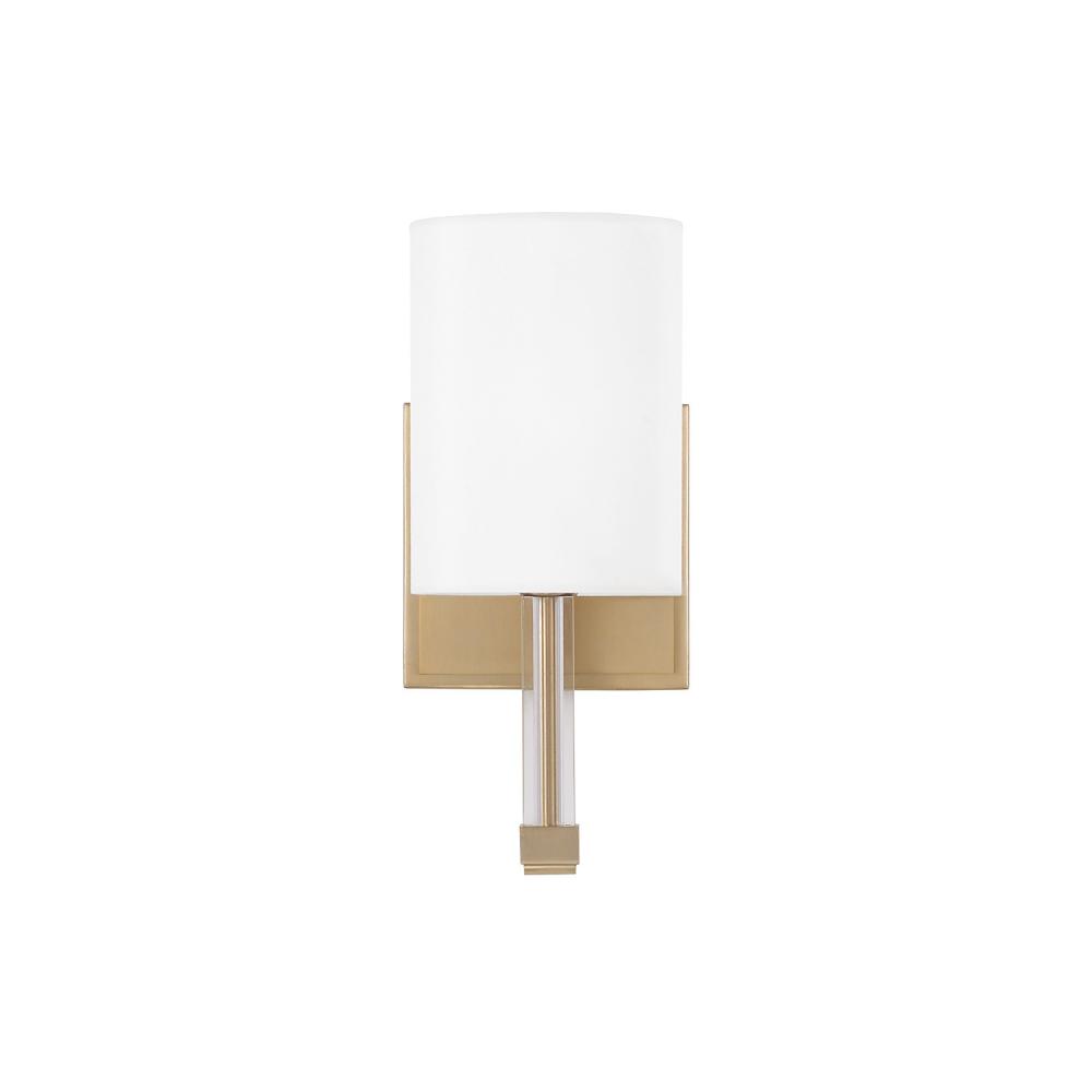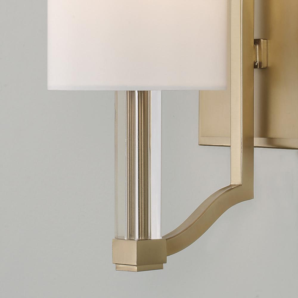 1-Lt Wallchiere Sconce in Matte Brass with Clear Acrylic Accents and Cylindrical White Fabric Shades by Capital Canada