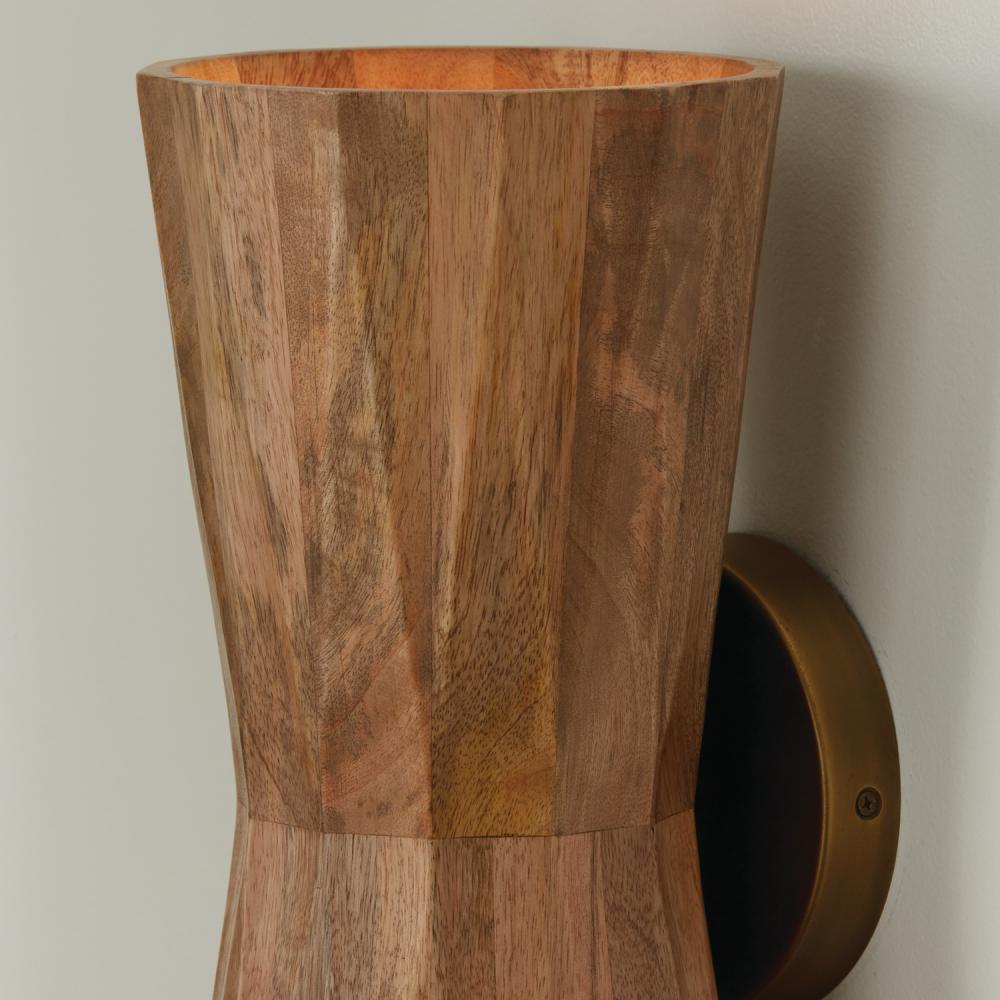 Handcrafted of light mango wood, the Nadeau Sconce creates a naturally fascinating luminaire. The hourglass silhouette and geometric texture paired with the hand-distressed painted Brass create intriguing dimension from every angle.
