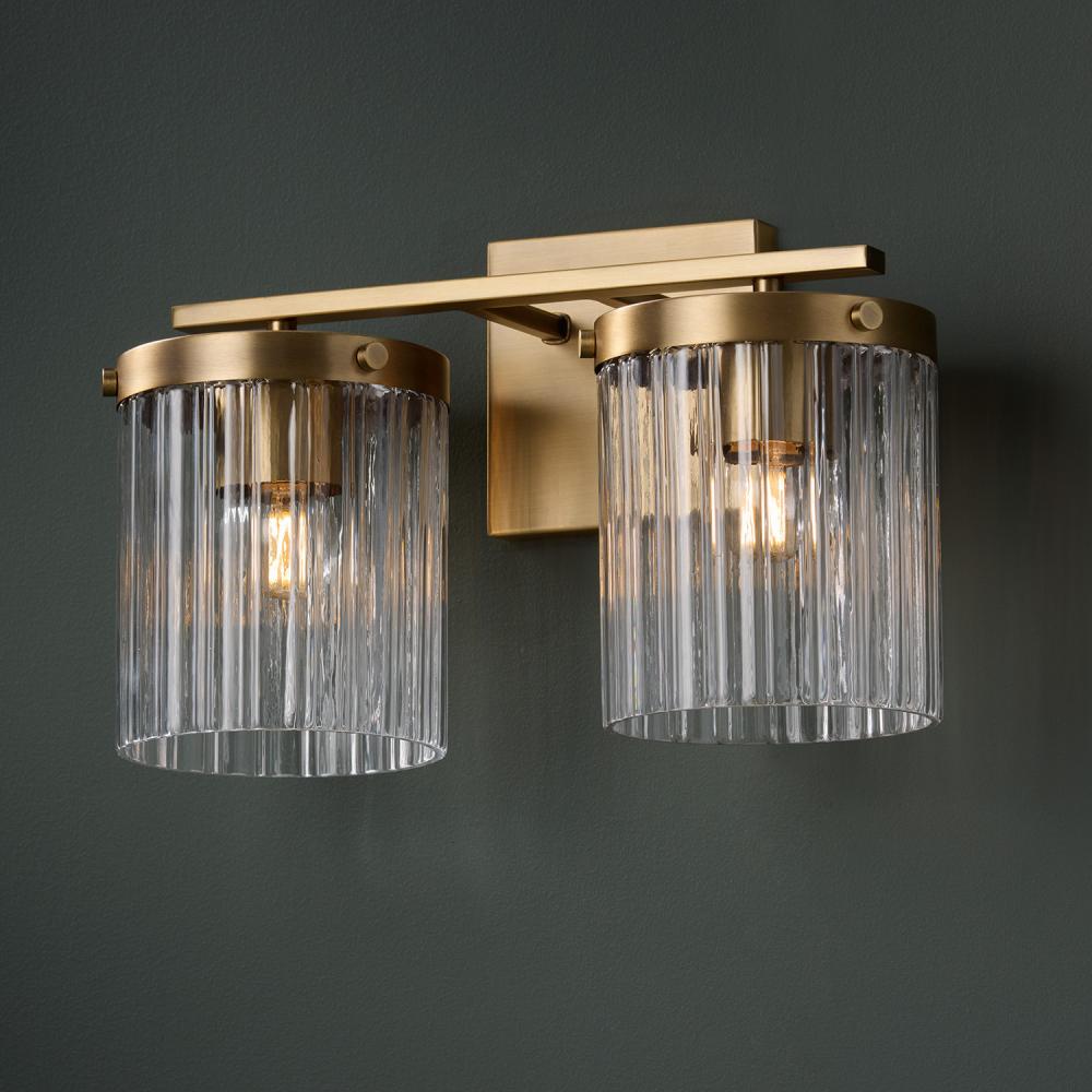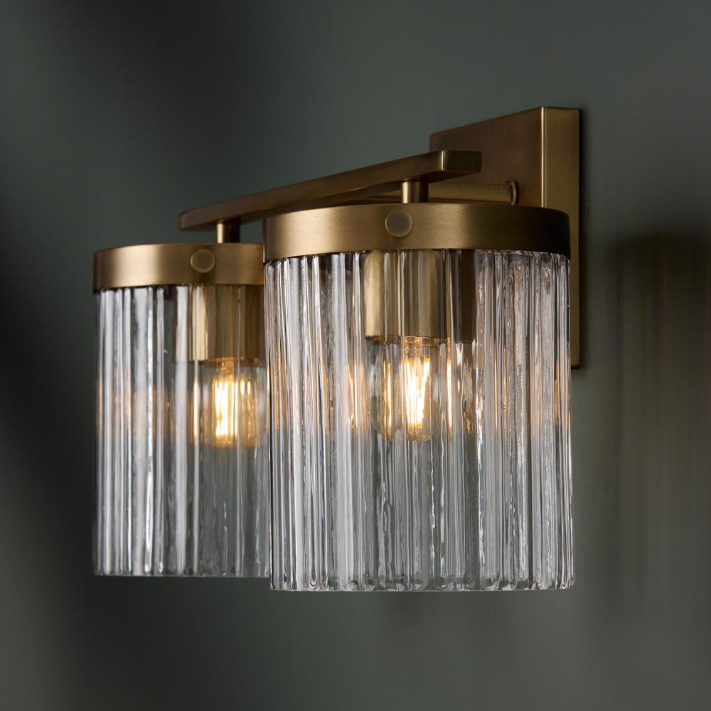 Invite stunning illumination to any powder room with the Vaughn 2-Light Vanity. The Beveled Fluted glass creates captivating texture against the cylindrical silhouettes, while the Aged Brass finish offers a versatile, timeless aesthetic.