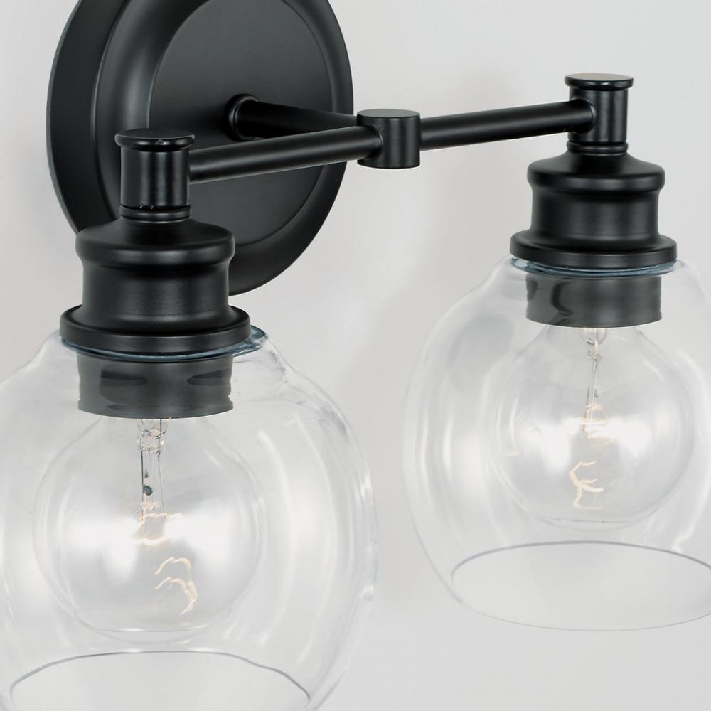 Subtle details enrich the minimalistic design of our Mid-Century 2-light vanity. These include gracefully contoured glass shades and the stepped detailing on the backplate, details that make it perfect for modern interiors. An Matte Black finish offers contrast and is easy to coordinate with faucets and other bath fixtures. It's also available in Aged Brass and Polished Nickel.