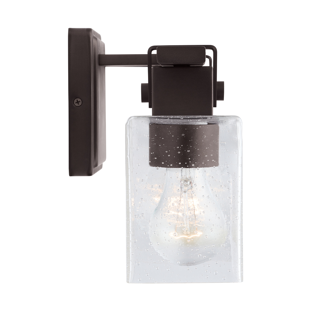 APPLICATIONS: Rated for damp locations, perfect for bathrooms and powder rooms. Rectangular seeded glass shades adorn this oil rubbed bronze fixture reminiscent of barn door hardware.