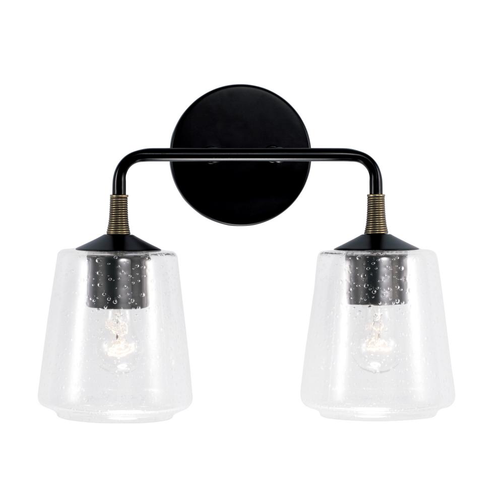 Designer details and clean lines dial up the drama with the Amara 2-Light Vanity. The wrapped accent in a brass tone adds a layer of unexpected dimension and the Matte Black finish and seeded glass punctuates the personality of any bathroom. Also available in a 3-Light or 4-Light.