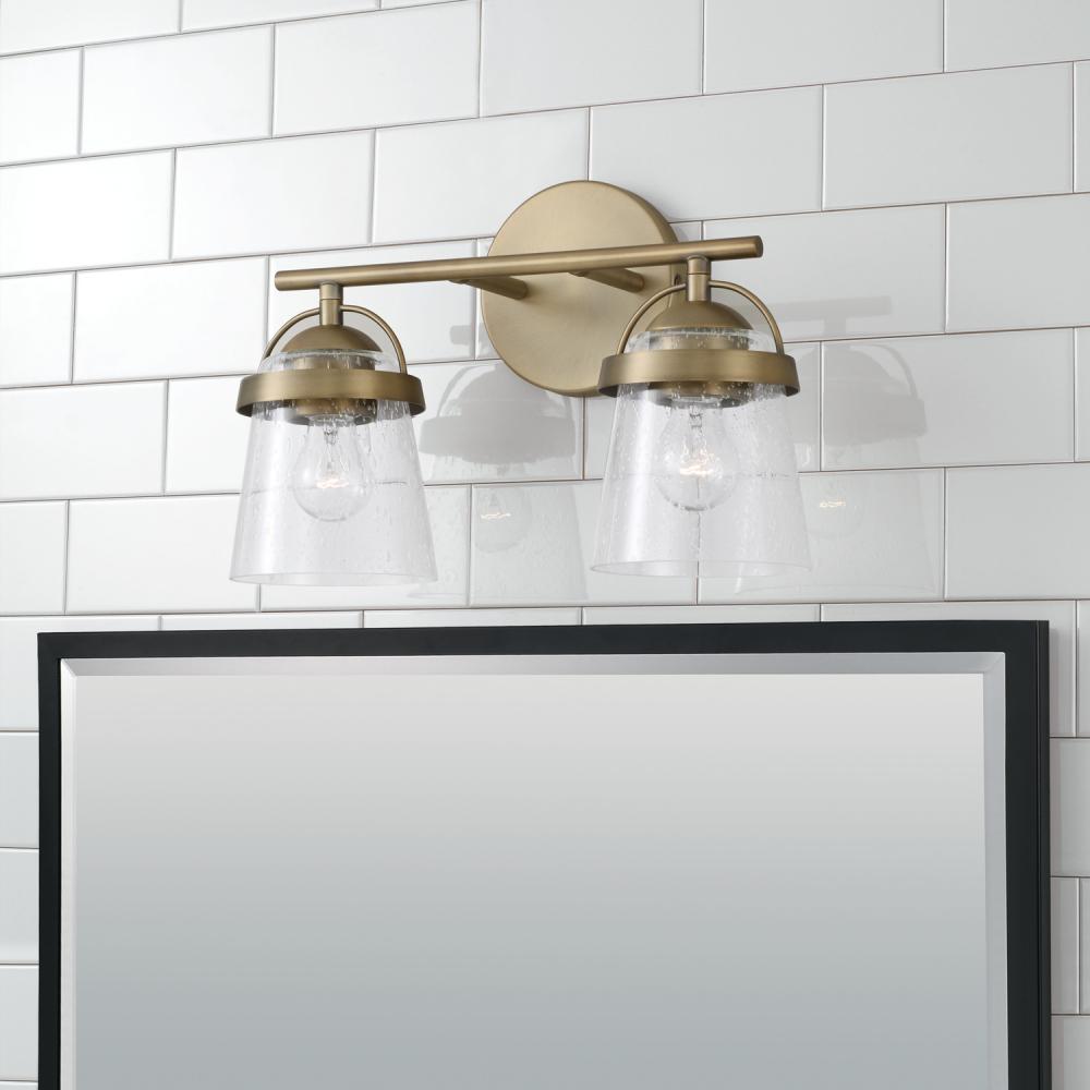 Chic curves and clean lines create the Madison 2-Light Vanity for Homeplace. The Aged Brass finish adds warmth and accents the seeded glass for standout style. Also available in 3-Light and 4-Light.