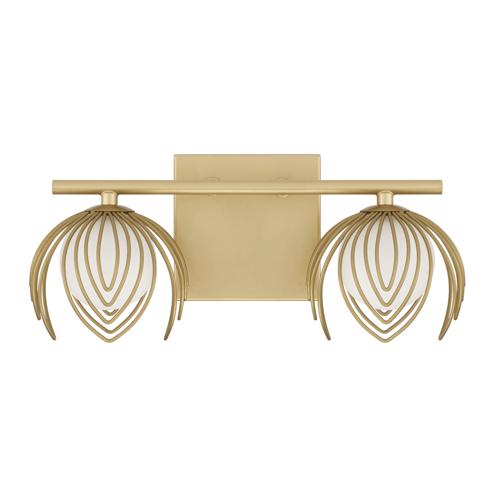 Romantic and artful, the Flora 2-Light Vanity exudes botanical charm in powder room settings. Soft White glass globes are surrounded by a floral motif of delicate bent wire petals, finished in our signature Buffed Gold to bring a vibrant, warm hue to this showstopping style. Also available in a 3-Light.