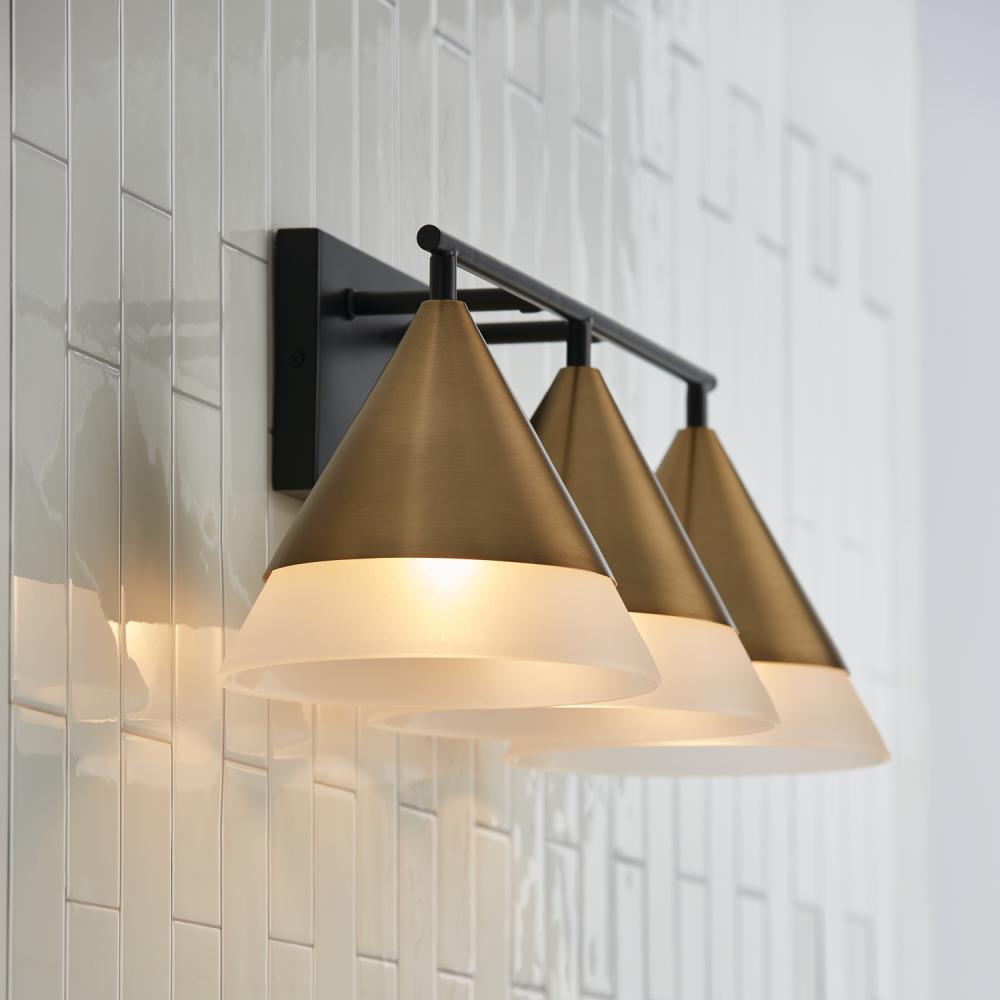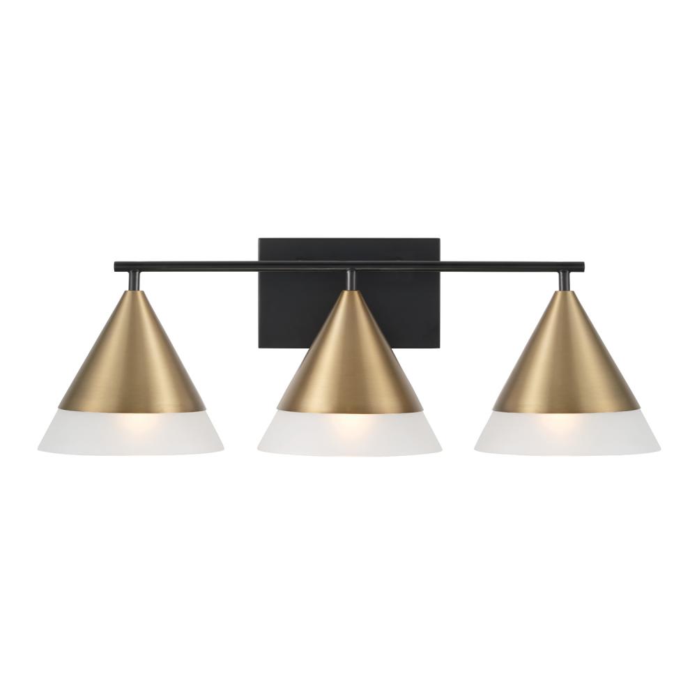 3-Light Cone Vanity in Black with Aged Brass and Frosted Glass Shades by Capital Canada