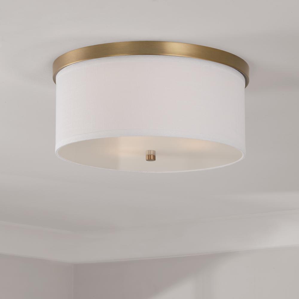 3-Light Flush Mount in Aged Brass - White Fabric Drum Shade with Diffuser by Capital Canada