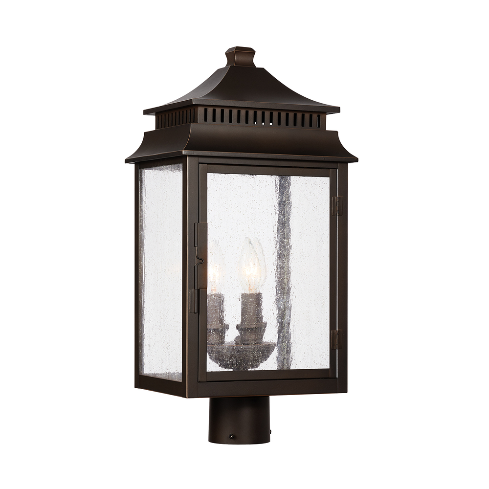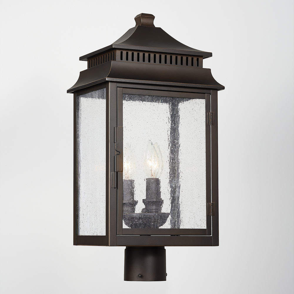 The pagoda-shaped lanterns in this outdoor collection are finished in Oiled Bronze, which feels beautifully aged with time. Each piece is crafted out of aluminum and finished with a UV-inhibitor protective powder-coat. Featuring antiqued rain glass and clean lines, these fixtures look great in all elements.