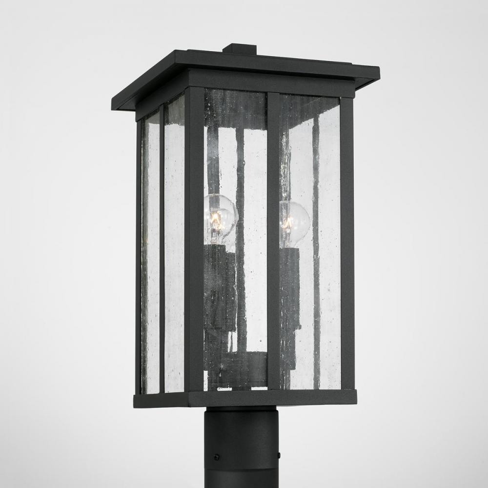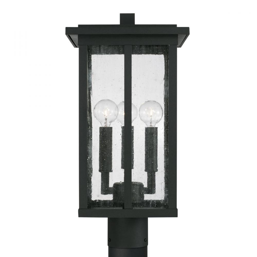 Clean lines and framed edges on the Barrett 3-Light Outdoor Post Lantern give a graphic punch without being too overpowering. The textured water glass diffuses light and emits a warm glow for your porch or patio. This fixture is part of our Rain or Shine Series and are backed by our five-year warranty.