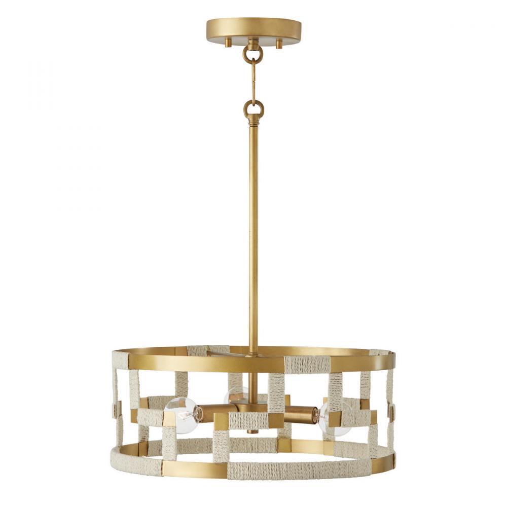 Bold and graphic patternwork command attention on this organic luxe Hala 3-Light Dual-Mount Pendant. The hand-applied patina on the unique brass finish accentuates the Greek key inspired design, while the textured bleached natural jute rope softens the sharp edges. This fixture can be used as a Semi-Flush or as a Pendant.