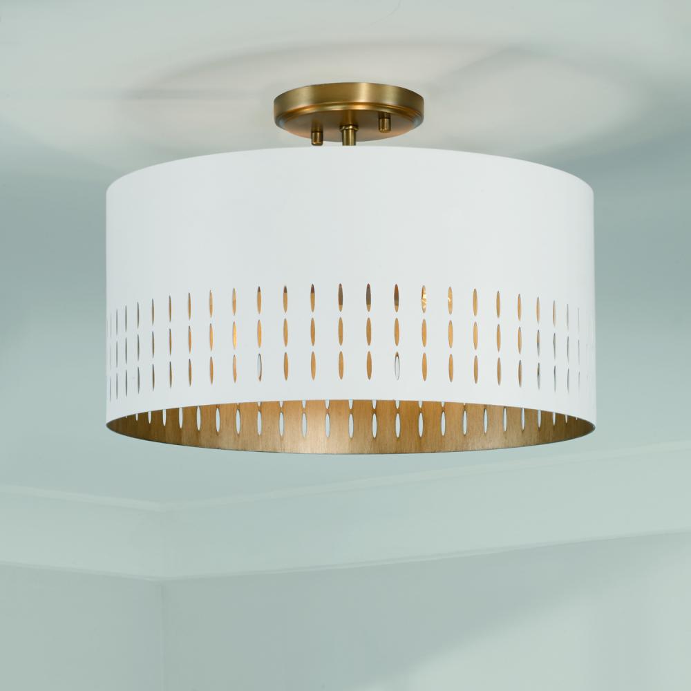 15.5"W x 9.5"H 3-Light Dual Mount Pendant or Semi-Flush in Aged Brass and White Metal Shade with Painted Aged Brass Interior