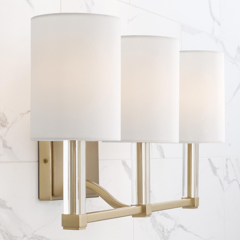3-Light Vanity in Matte Brass with Clear Acrylic Accents and Cylindrical White Fabric Shades by Capital Canada