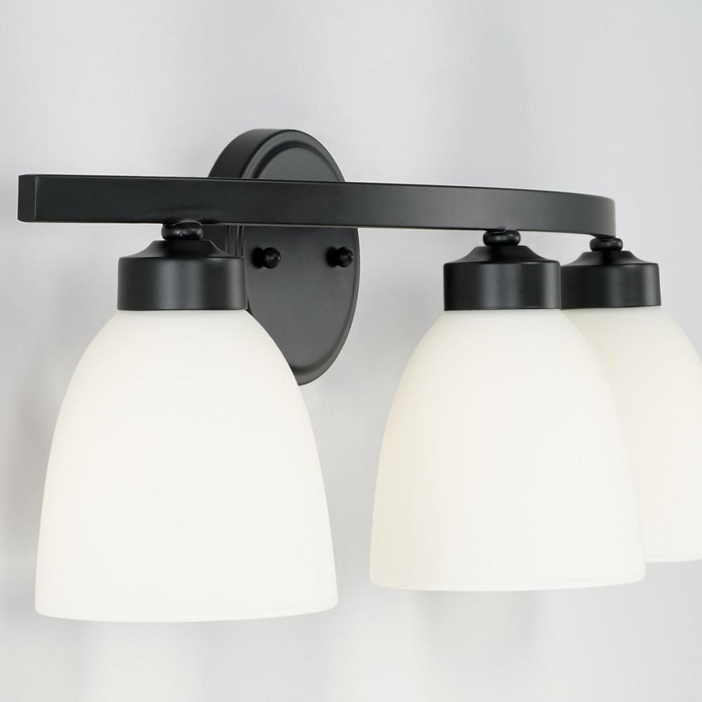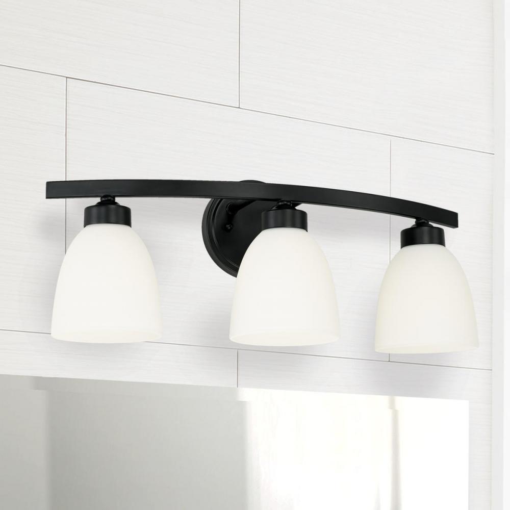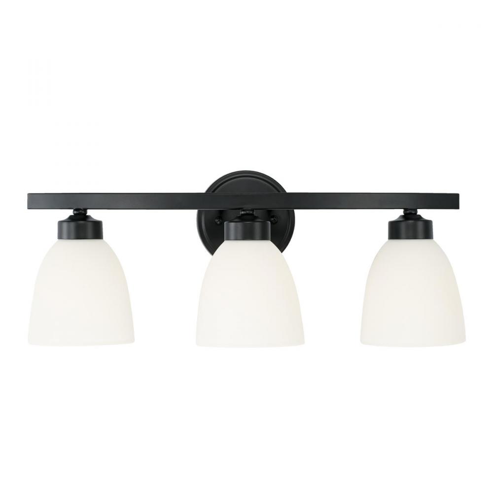 Clean lines and Sleek silhouettes create the Jameson 3-Light Vanity for HomePlace. The soft white glass complements the Matte Black finish for a contemporary update to the transitional look.