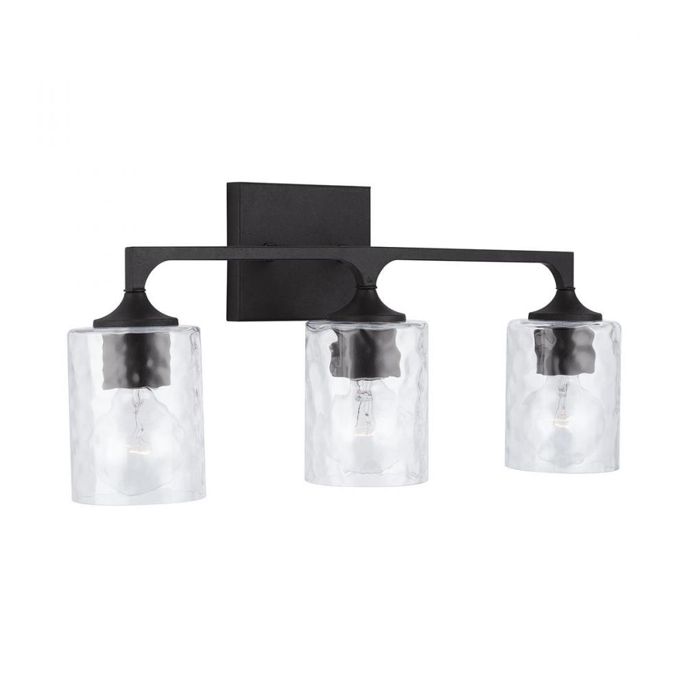Understated, simple lines beautifully complement the bold prominence of the Black Iron finish on the Clint 3-Light Vanity. The unique corner details of this transitional design are reminiscent of turn of the century style. Featuring dimpled water glass, this vanity is available as a 2-light or 3-light.