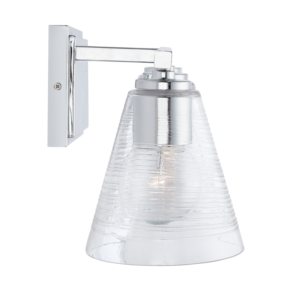 APPLICATIONS: Rated for damp locations, perfect for bathrooms and powder rooms. The brilliant chrome finish is on this super simple piece pops with the addition of the unusual striped conical clear glass shades.