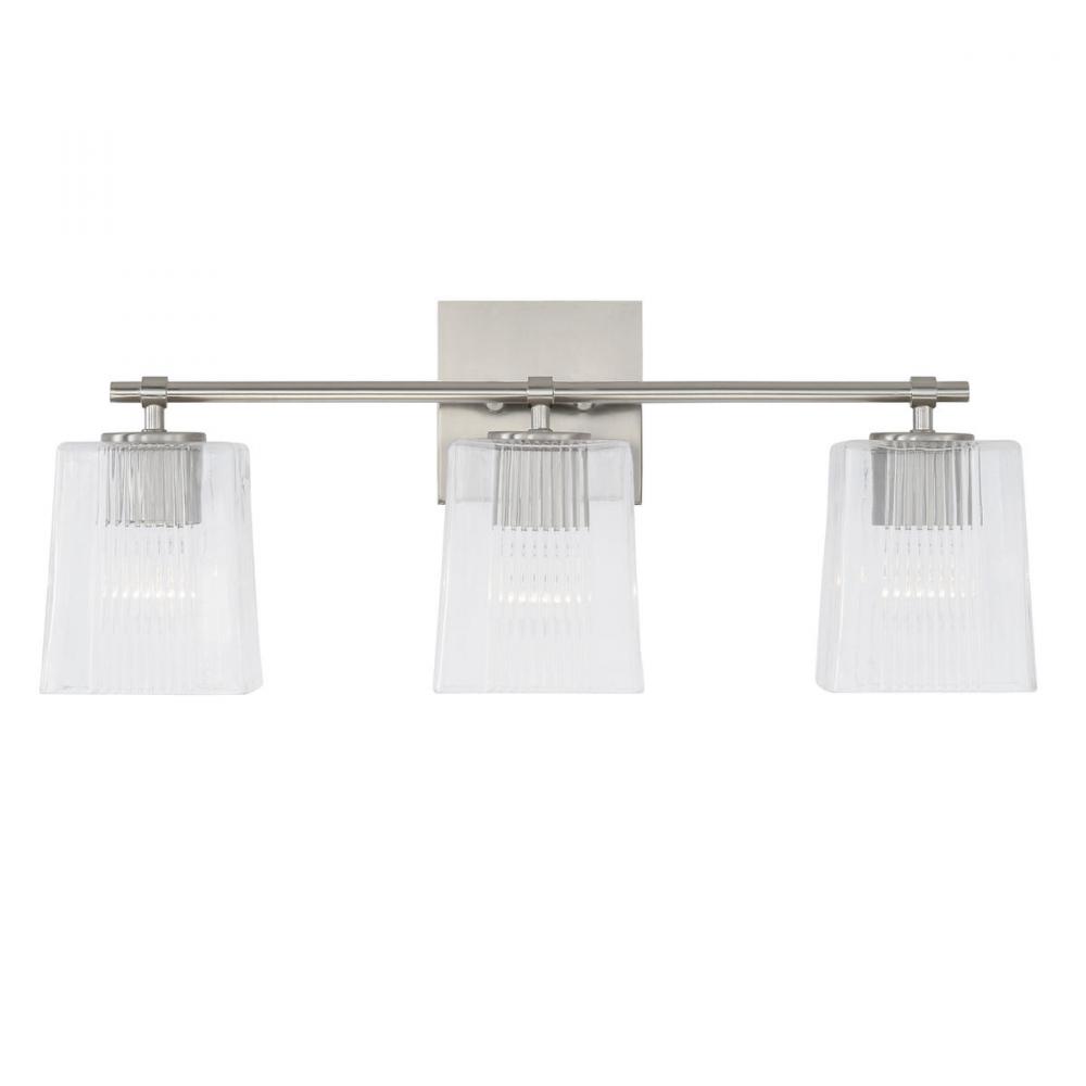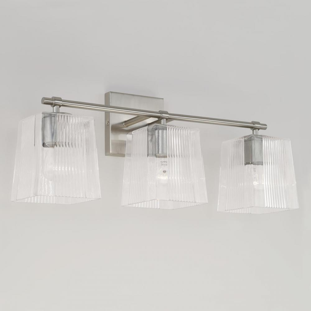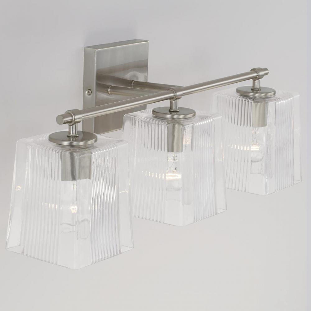 The chic fluted details on the Lexi 3-Light Vanity create character and visual interest. The tapered square glass shades sparkle, are accented by a sleek, Brushed Nickel frame. These fixtures are available as a 2-light or 3-light.