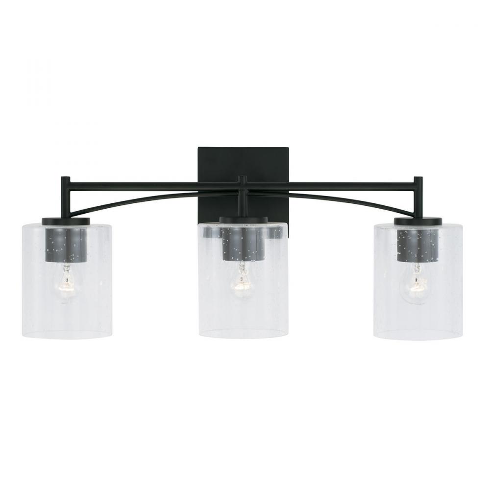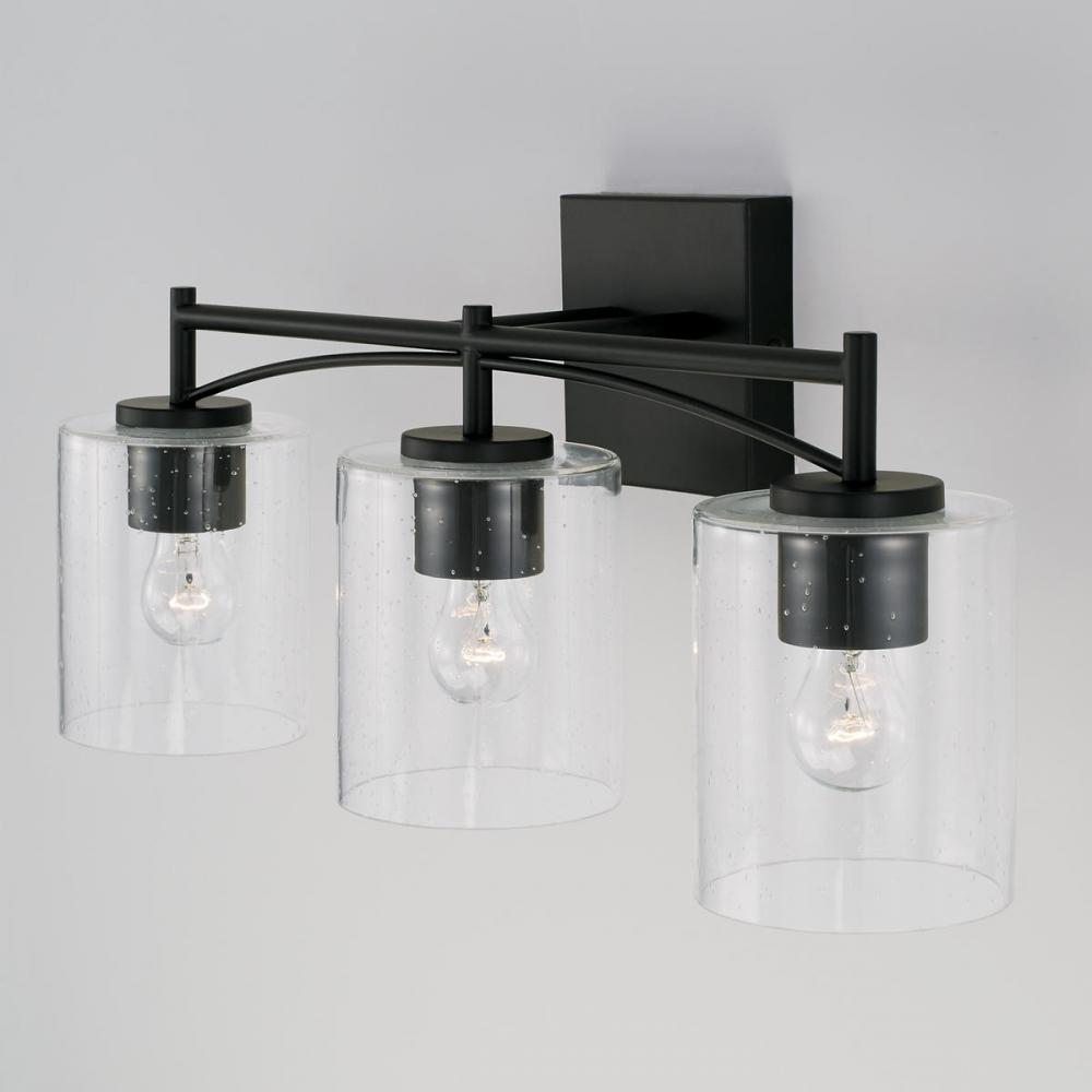The sharp lines and artistic arches of the Peyton 3-Light Vanity are timelessly transitional. The muted tone of the Matte Black finish allows the seeded glass shade to take center stage. This fixture is available as a 2-light or 3-light.