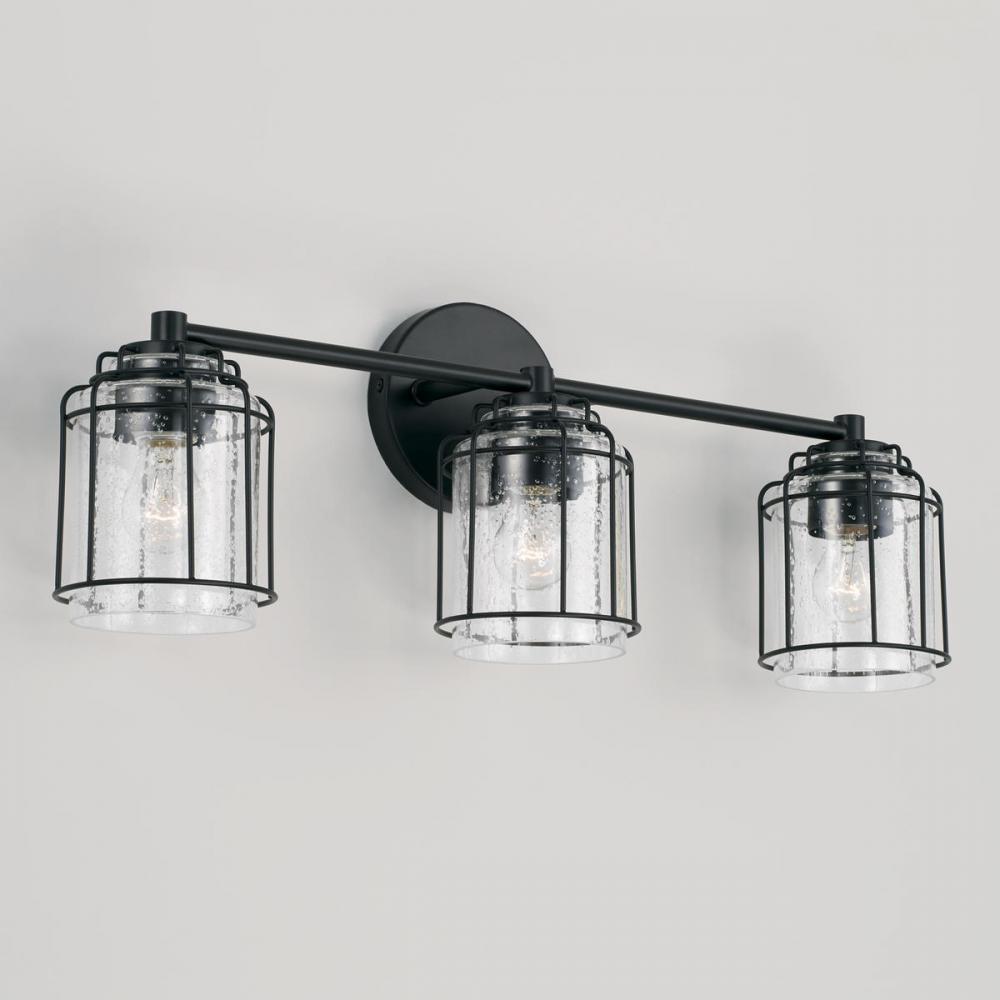 Inspired by a vintage walking lantern, the Harmon 3-Light Vanity evokes farmhouse flair. The seeded glass shades complement the cage silhouette in a Matte Black finish for a style that will stand the test of time.