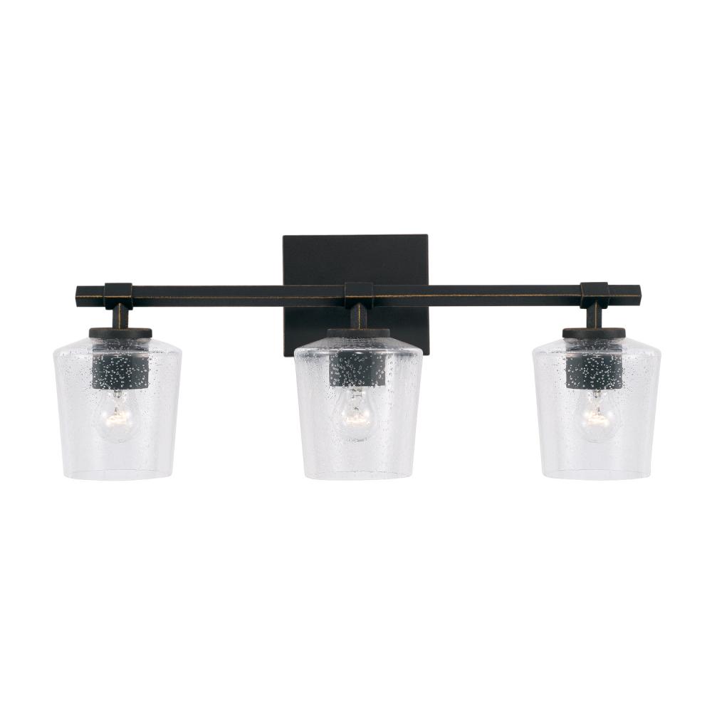 Bold and classic, the Ogden 3-Light Vanity brings a modern look to turn-of-the-century style. The Brushed Black Iron finish adds visual texture, and the gold highlights accent the clear seeded glass for intriguing dimension. Also available in 2-Light or 4-Light.