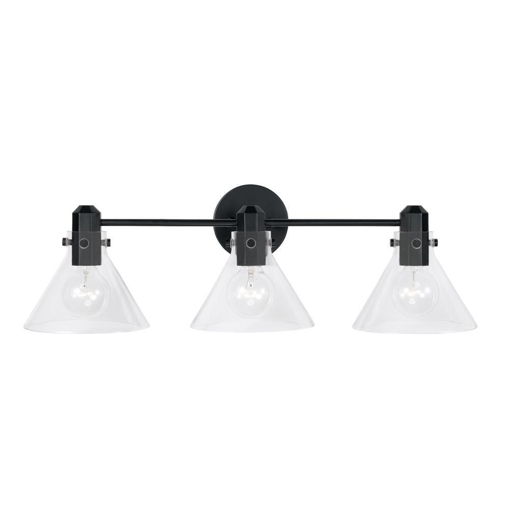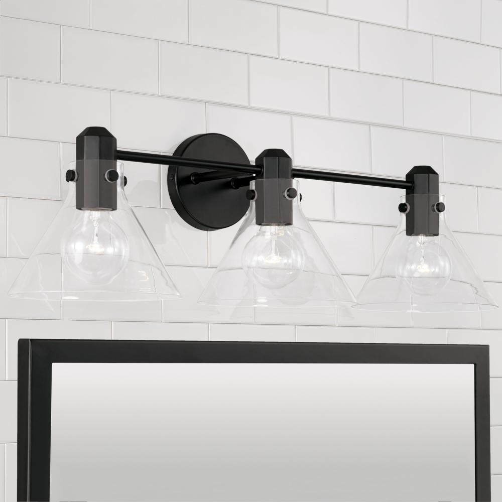 A modern take on midcentury style, the Greer 3-Light Vanity brings understated style to any bathroom. The faceted socket and rivet details in Matte Black adds a pop of personality to the tapered glass. Also available in a 2-Light.