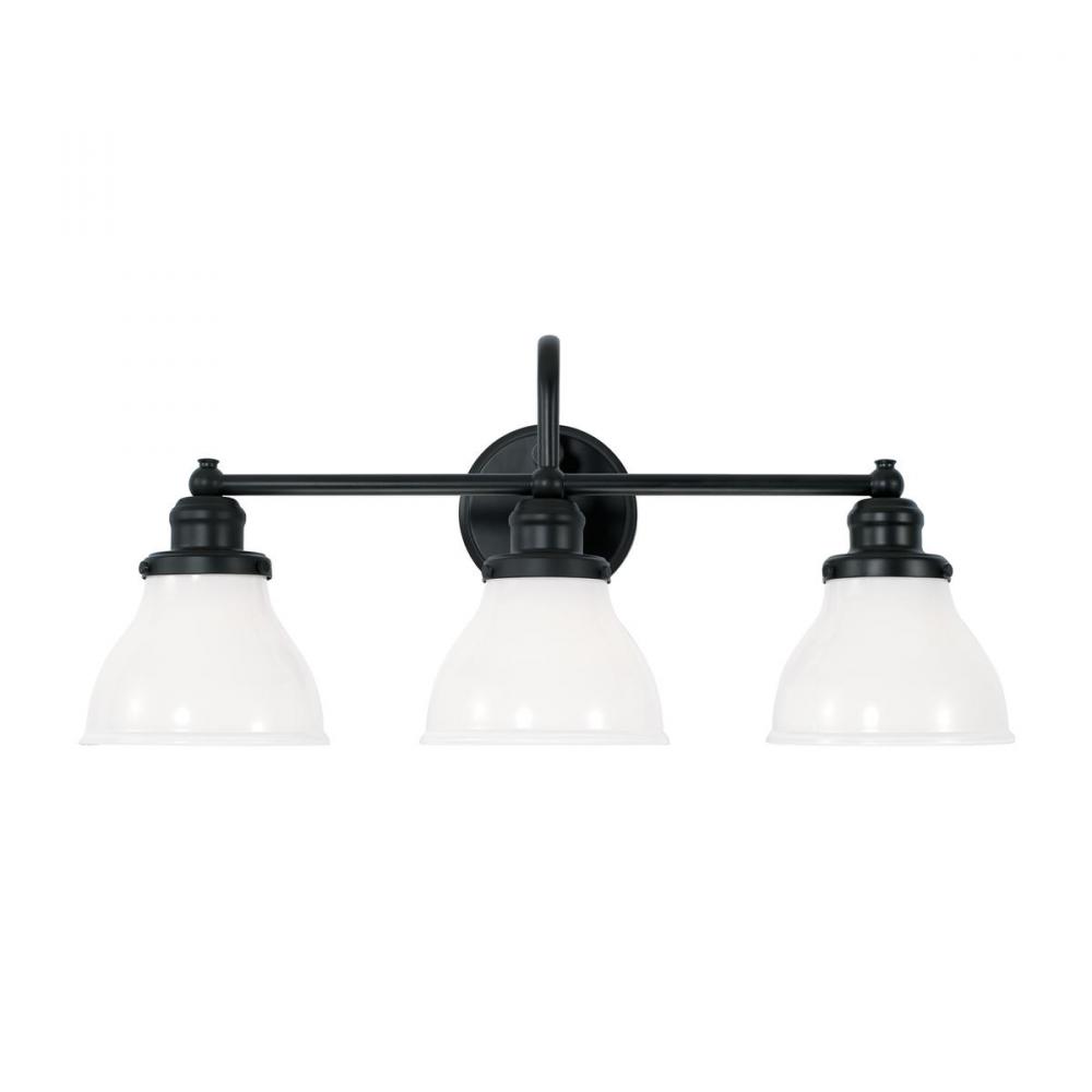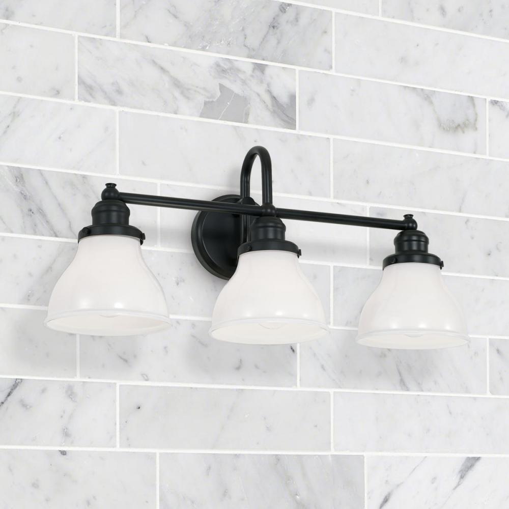 Featuring a Matte Black finish and cloche-style Milk Glass shades, the Baxter 3-light vanity brings tasteful illumination to your bath. Its clean profile is marked by a centrally positioned, u-shaped arm and a straight rod, conveying industrial inspiration.
