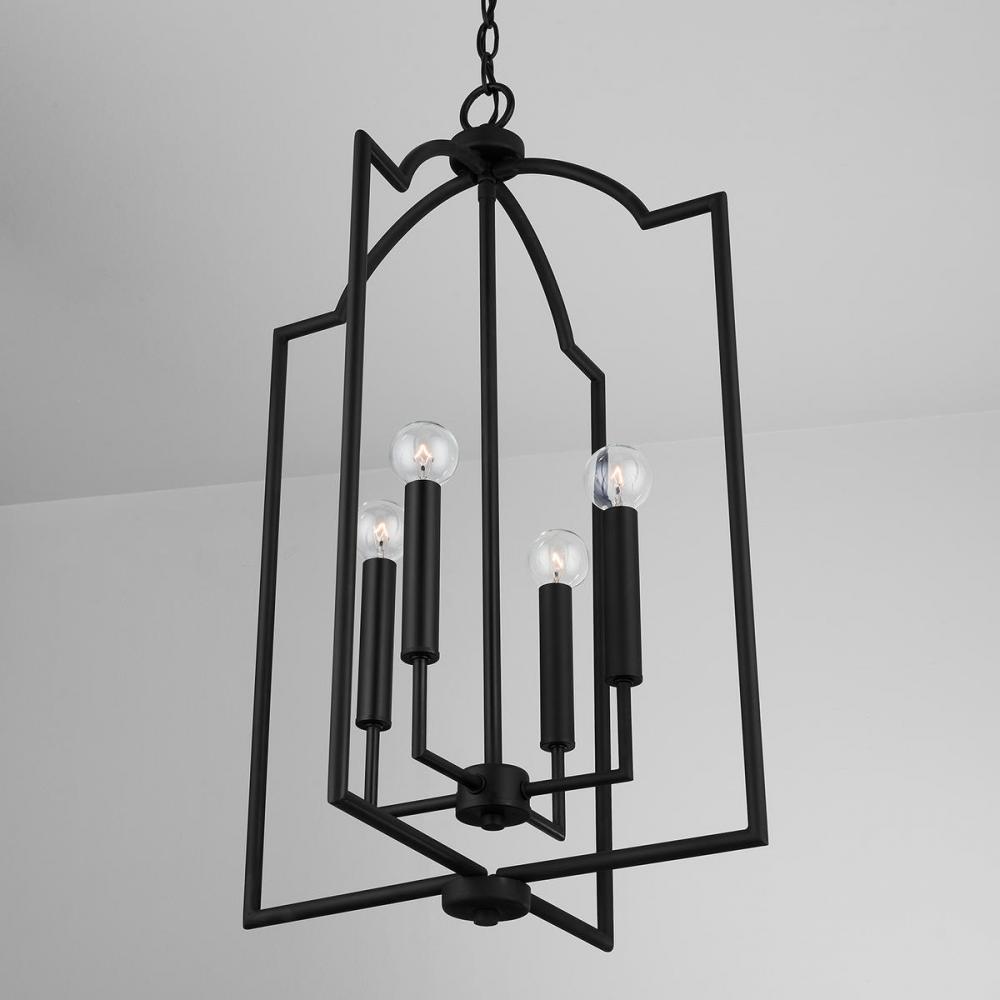 Taking a cue from iconic modern design patterns, these versatile fixtures are both streamlined and sculptural. The unique shape of this 4-light lantern-style foyer is available in Brushed Nickel, Matte Black or Bronze.