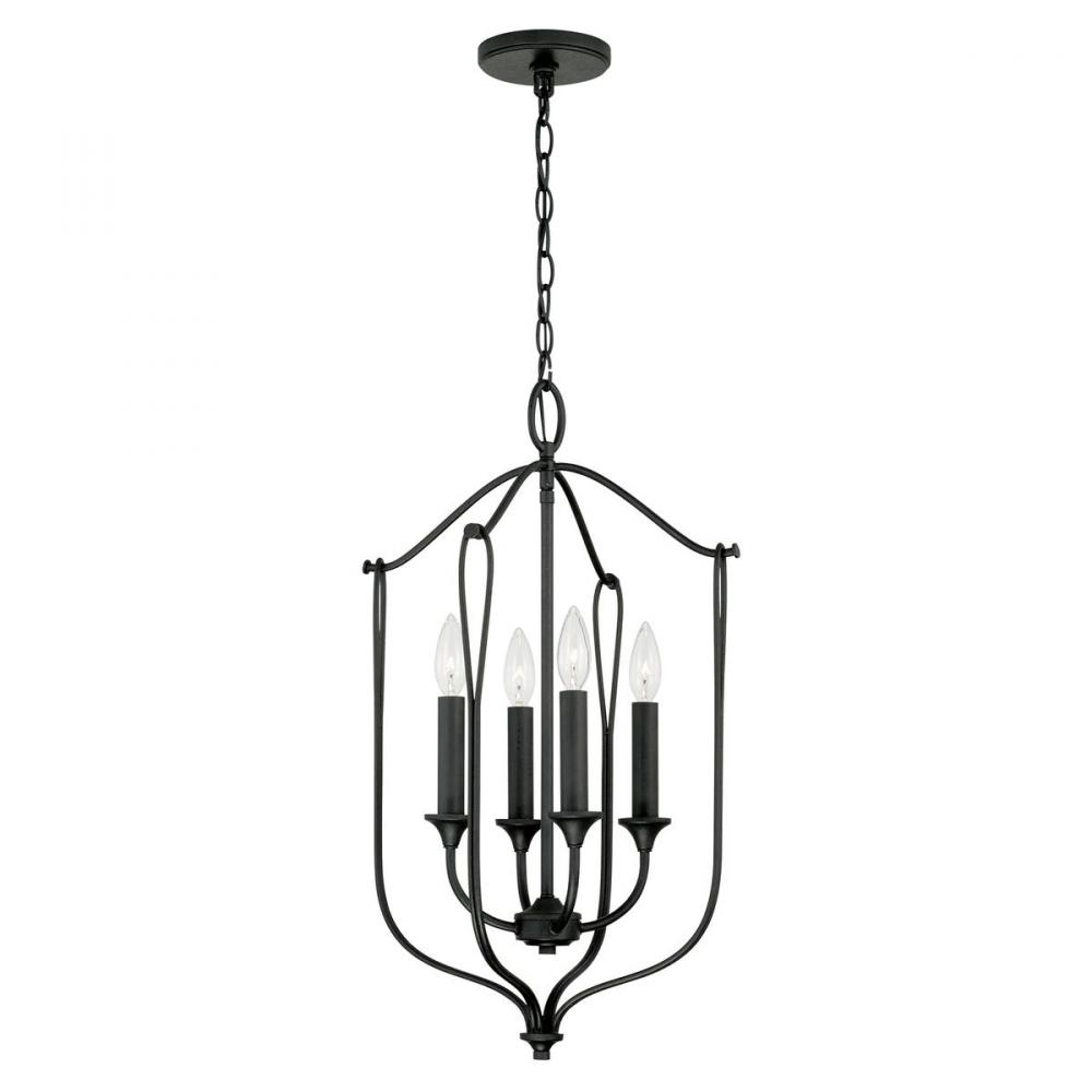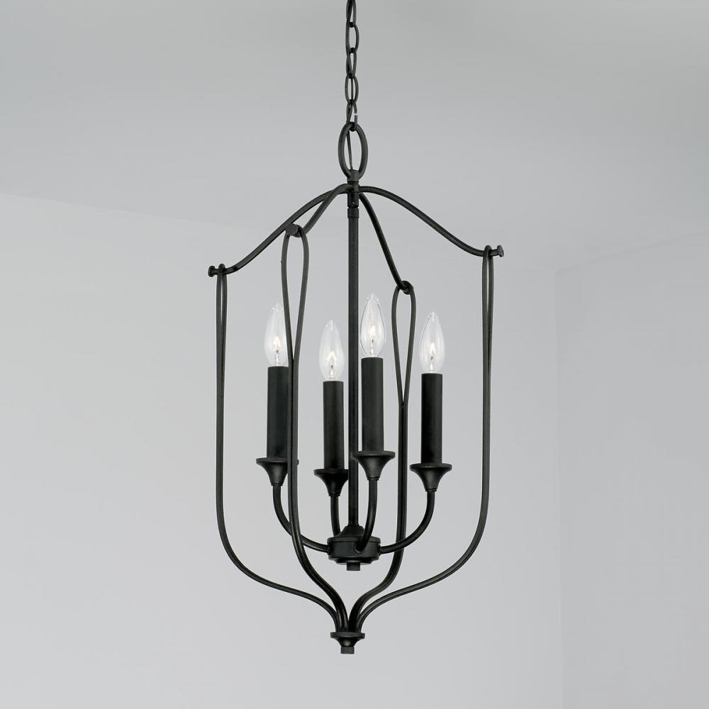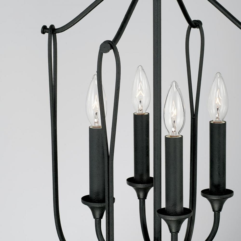 The whimsical silhouette and artistic loop detail of the Bentley 4-Light Foyer makes a sculptural statement. The rugged texture of the Black Iron finish and nail head accents add character to the airy design.