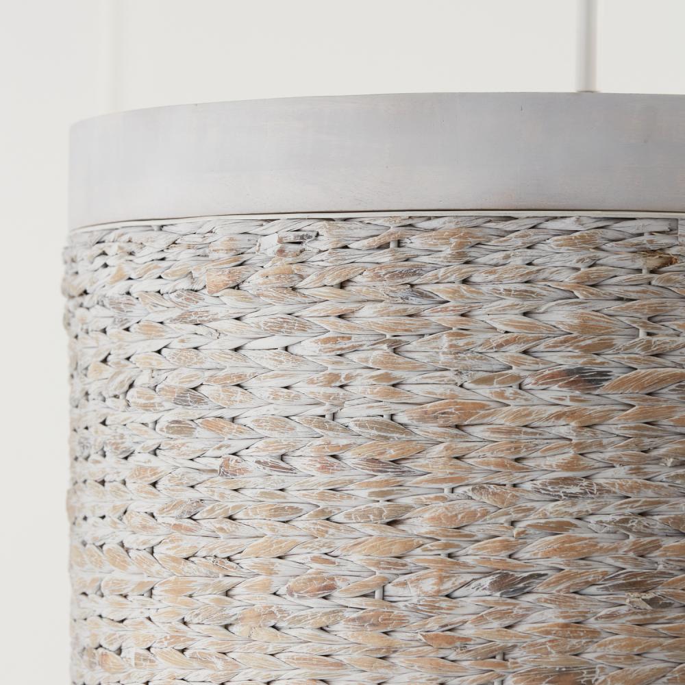 DETAILS: Artisan made and handcrafted of natural materials; A hand-turned Mango Wood cap tops the Water Hyacinth hand-woven drum, then given a hand-applied, white-washed finish; natural variation will occur.