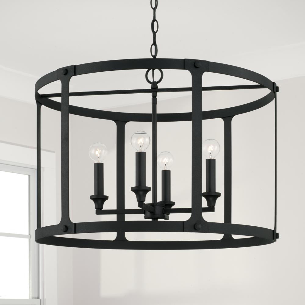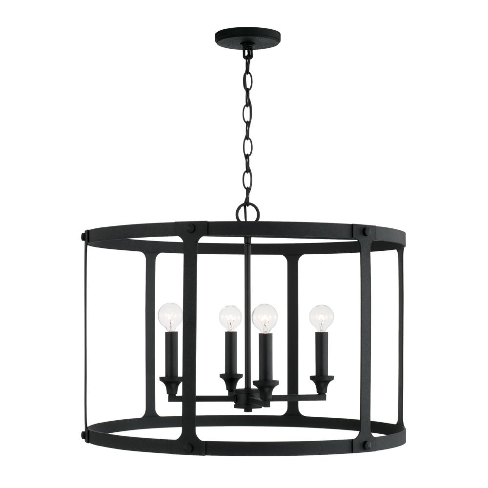 Bold lines and punctuated details create the Brennen Large Pendant. The Black Iron finish and rivet head accents provide a rugged, visual texture for industrial appeal.
