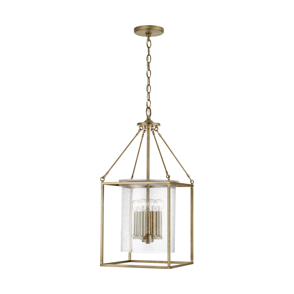 The rectangular cages of this 4-Light Pendant encompass a seeded glass cylinder for a layered look.