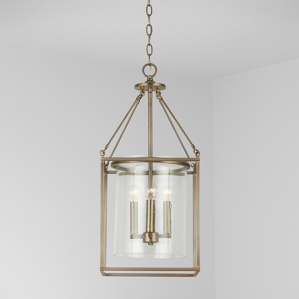 APPLICATIONS: Perfect for use in the kitchen, dining room, living room, foyer, bedroom or office. Seeded glass cylinder is suspended in an aged brass rectangular design.