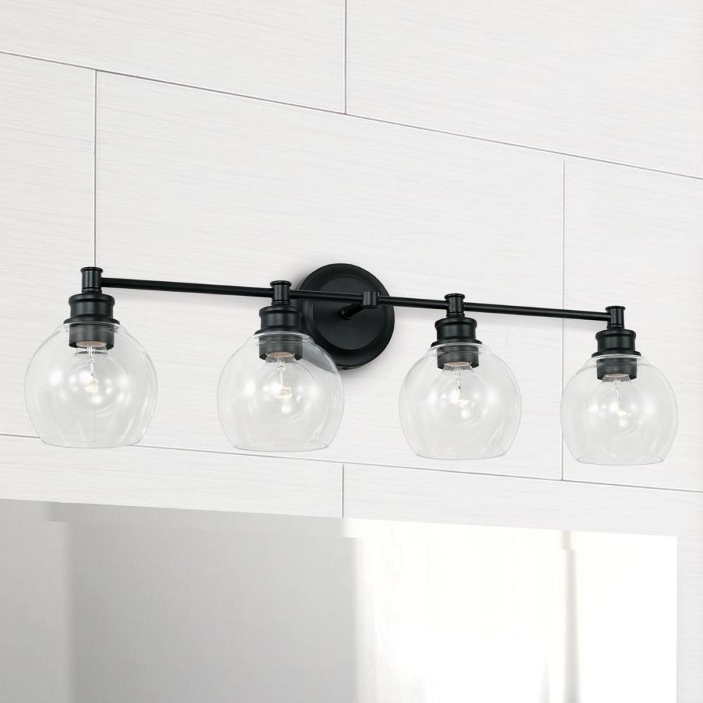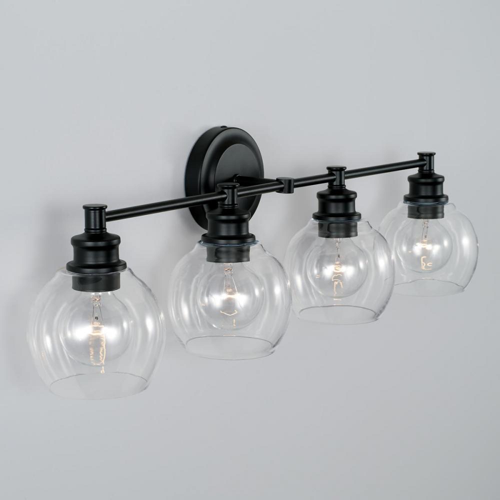 Balancing form and function, our Mid-Century 4-light vanity gives off subtle hints of character with minimal ornamentation. A beveled backplate lends a little depth to its linear form while rounded glass shades curve ever so slightly at the base to create graceful contours. These fine touches combined with the Matte Black finish make this light fixture a welcome addition to any bath.