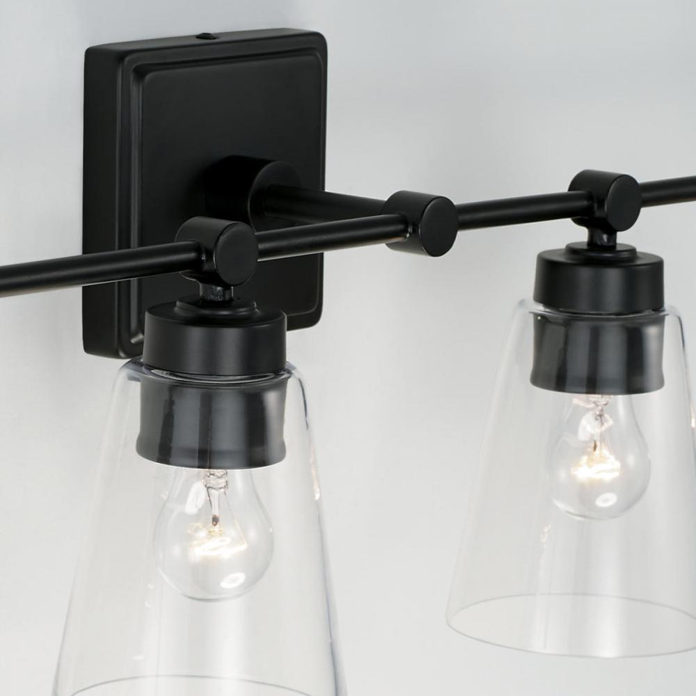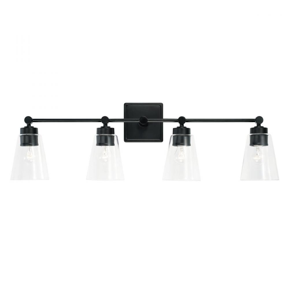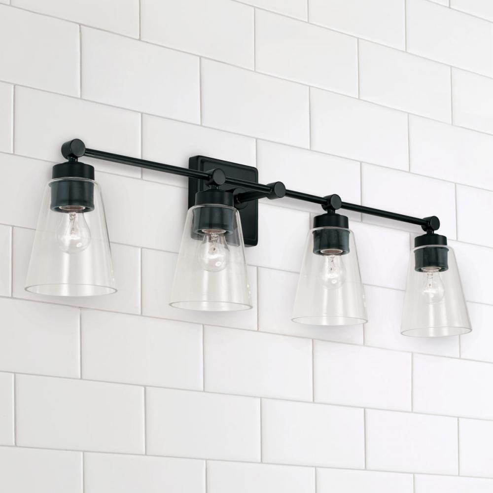 Pronounced rivets and bold lines create a captivating contrast to the conical glass of the 4-Light Vanity. The multiple finish options allow for versatility and lend itself to an array of design aesthetics. Vanity is also available in 2-Light and 3-Light options.