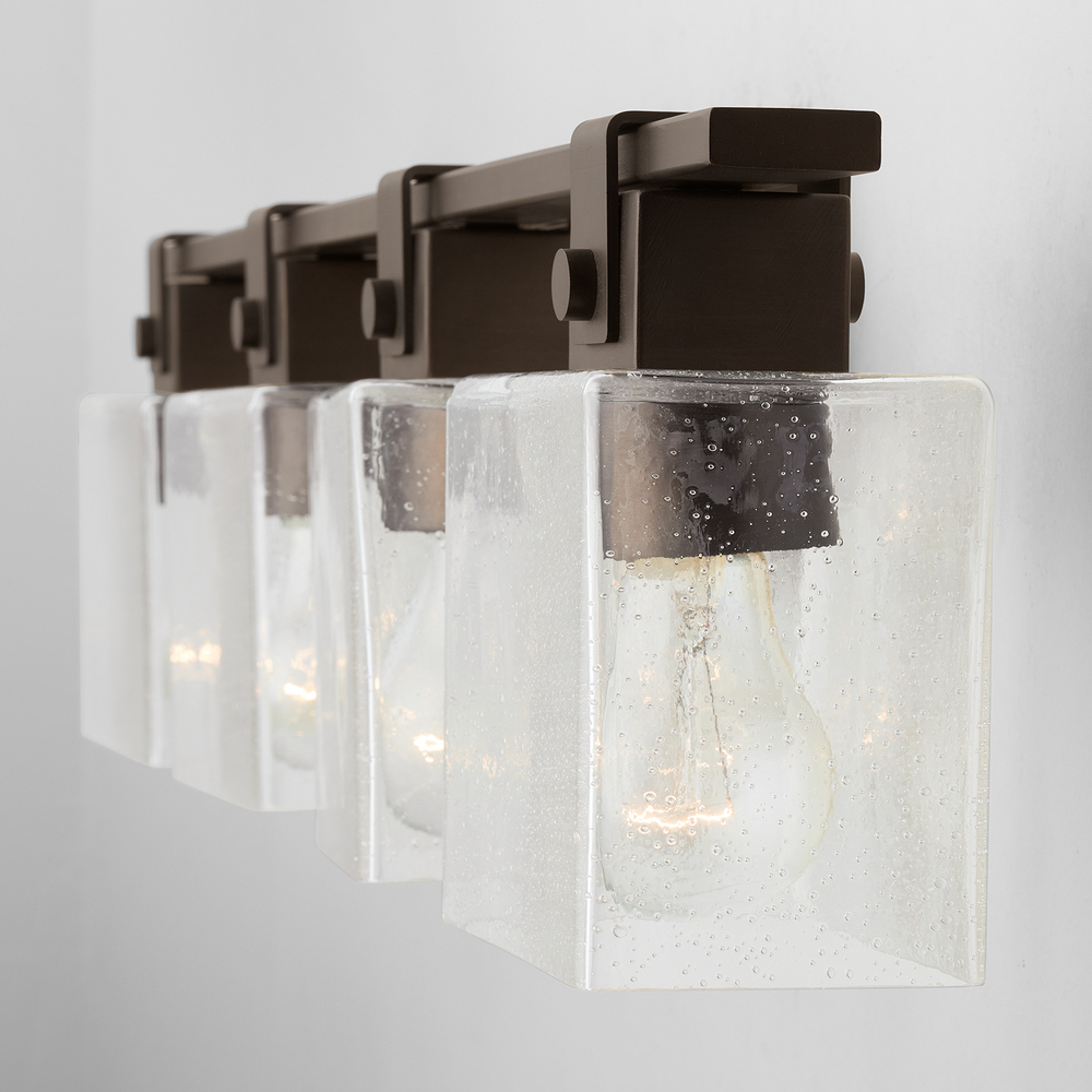 The unique rectangular shape of this seeded glass in the 4-Light Vanity is suspended by an equally interesting farmhouse accent inspired by a barn door track.