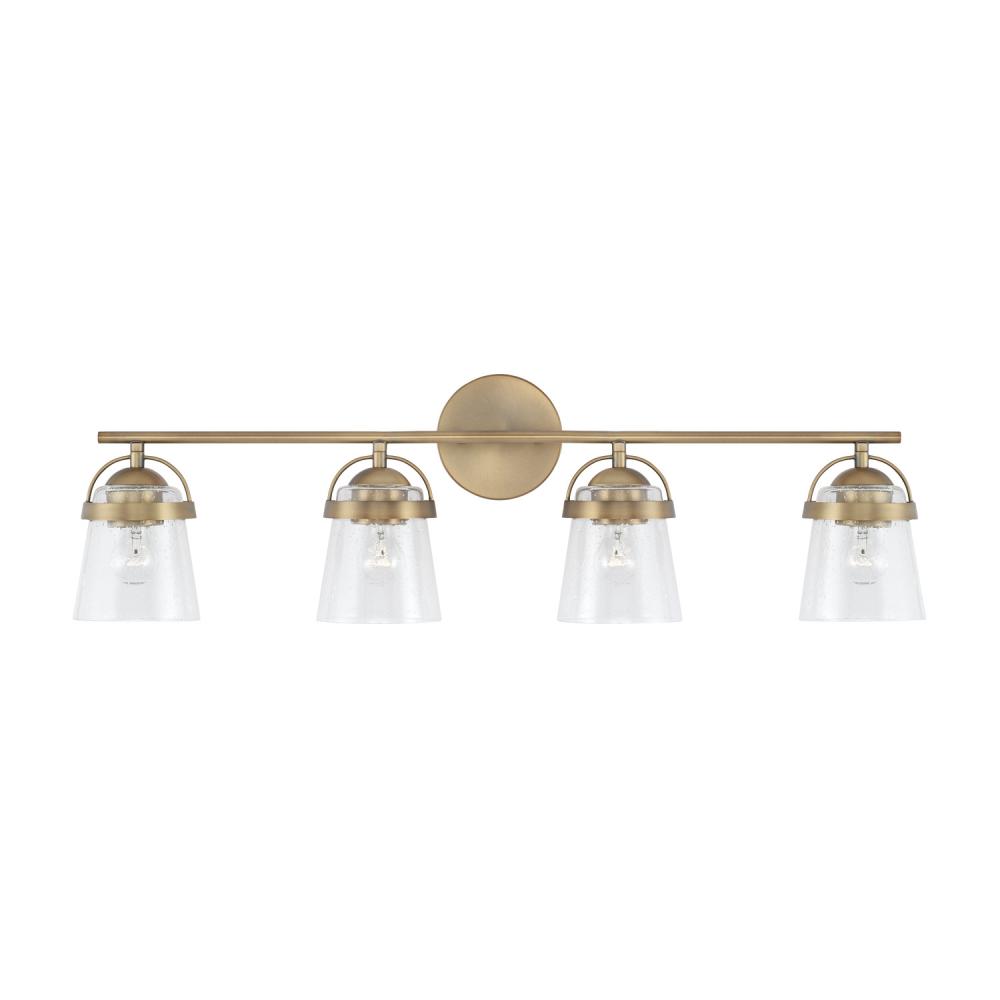 Chic curves and clean lines create the Madison 4-Light Vanity for Homeplace. The Aged Brass finish adds warmth and accents the seeded glass for standout style. Also available in 2-Light and 3-Light.