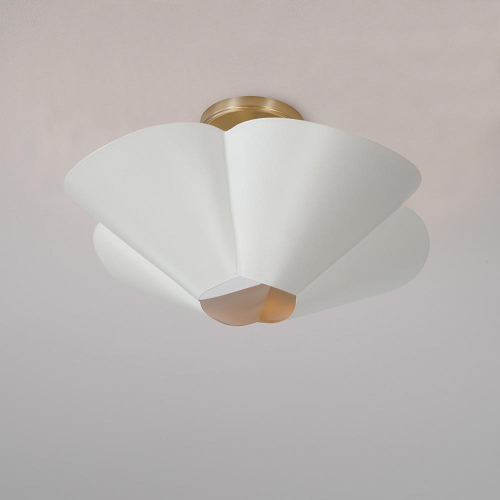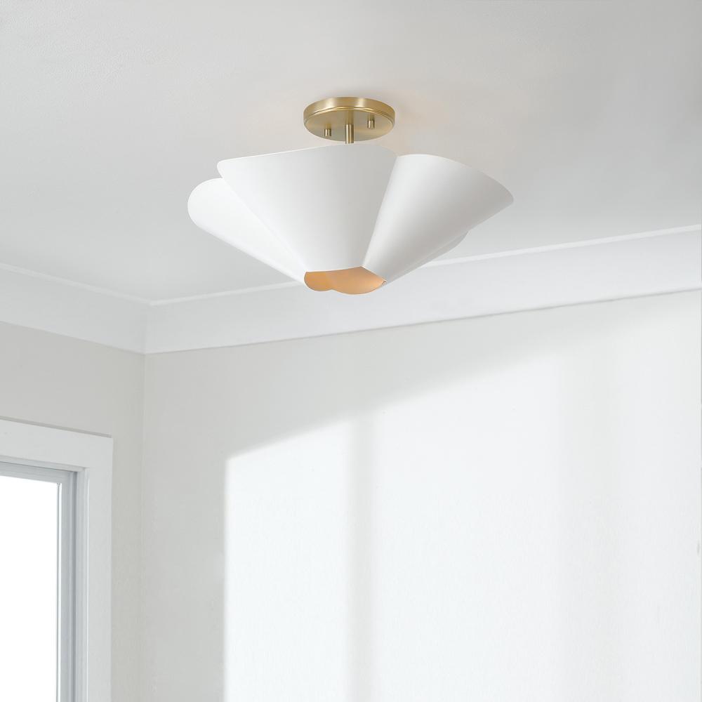 Invite all-around chic style with the 18.75 inch wide Maeve Small Dual Mount. Whether hung as a pendant or semi flush, the subtle curvature of the petal-like shade evokes a botanical feel, enhanced by the rectangular-shaped designer chain and sophisticated two-tone finish of smooth Matte White and painted Matte Brass interior.