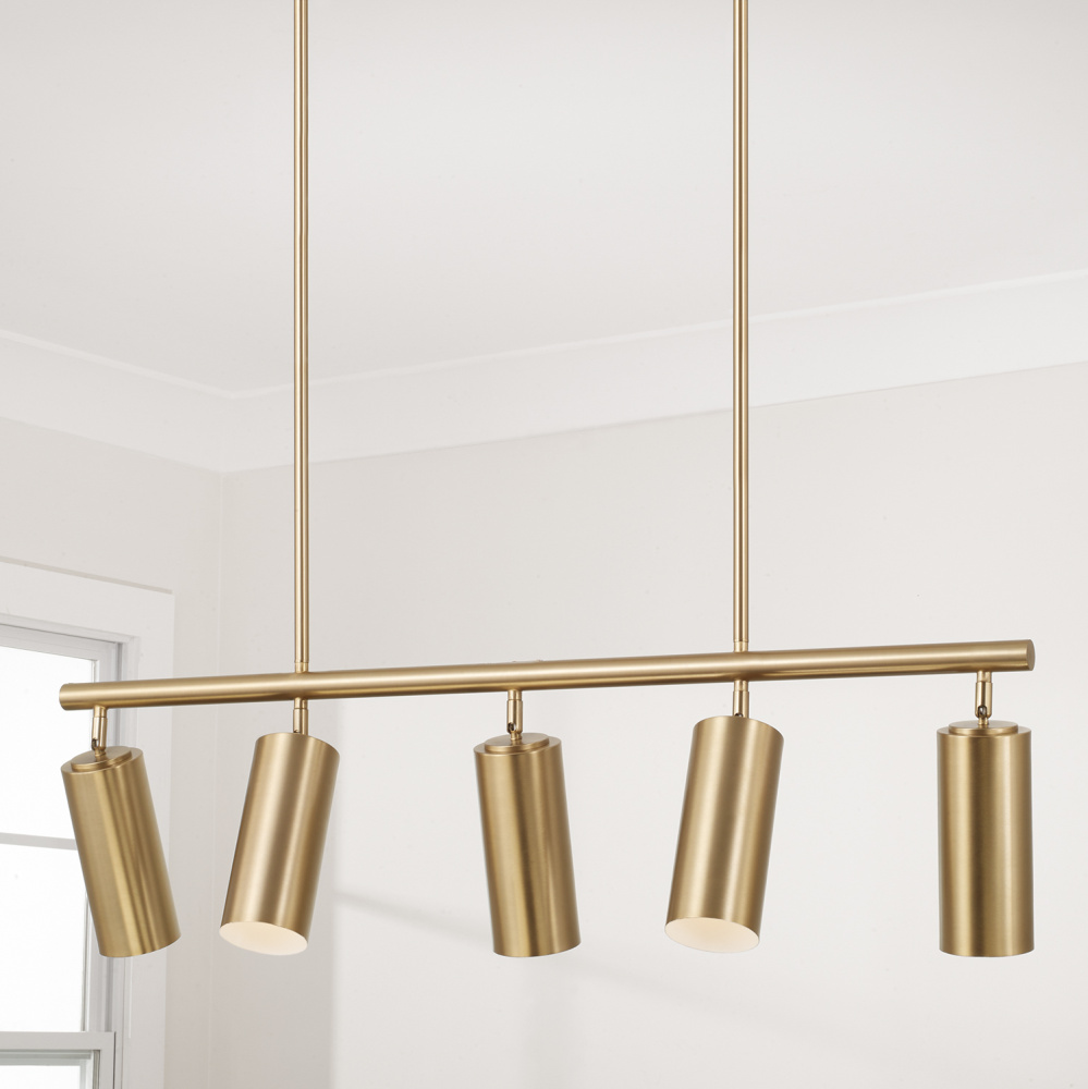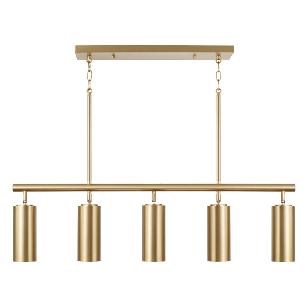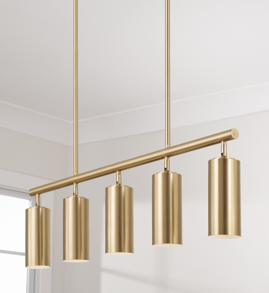 Smooth, cylindrical forms create the Robbie Linear Chandelier. Finished in Aged Brass, this contemporary luminaire showcases a touch of contrast with an interior White finish. Each metal cylinder pivots to direct the illumination, bringing modern versatility to beautiful task lighting.