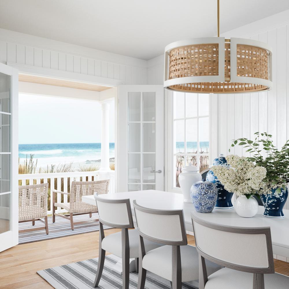 A modern mix of coastal and luxe styles, the Lola Chandelier beautifully blends natural materials. The Flat White painted frame is crafted of mango wood and pairs perfectly with the warm tones of the woven rattan while the Matte Brass finish details add a subtle touch of glamour creating a captivating contrast.