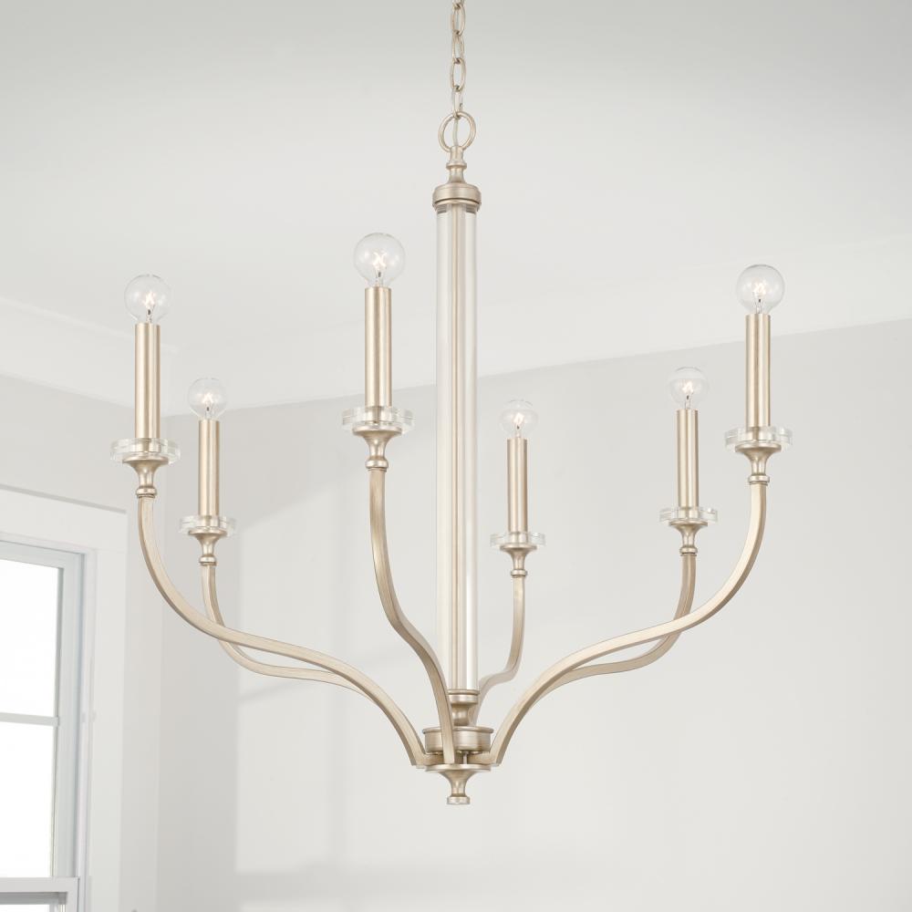 The romantic curves of the Breigh Medium Chandelier creates a soft, sophisticated style. The Brushed Champagne finish adds a subtle texture and glistens off the acrylic accents for a look with understated glamour.