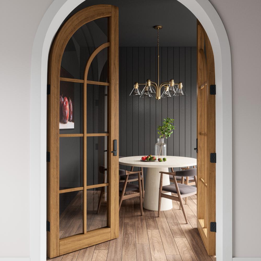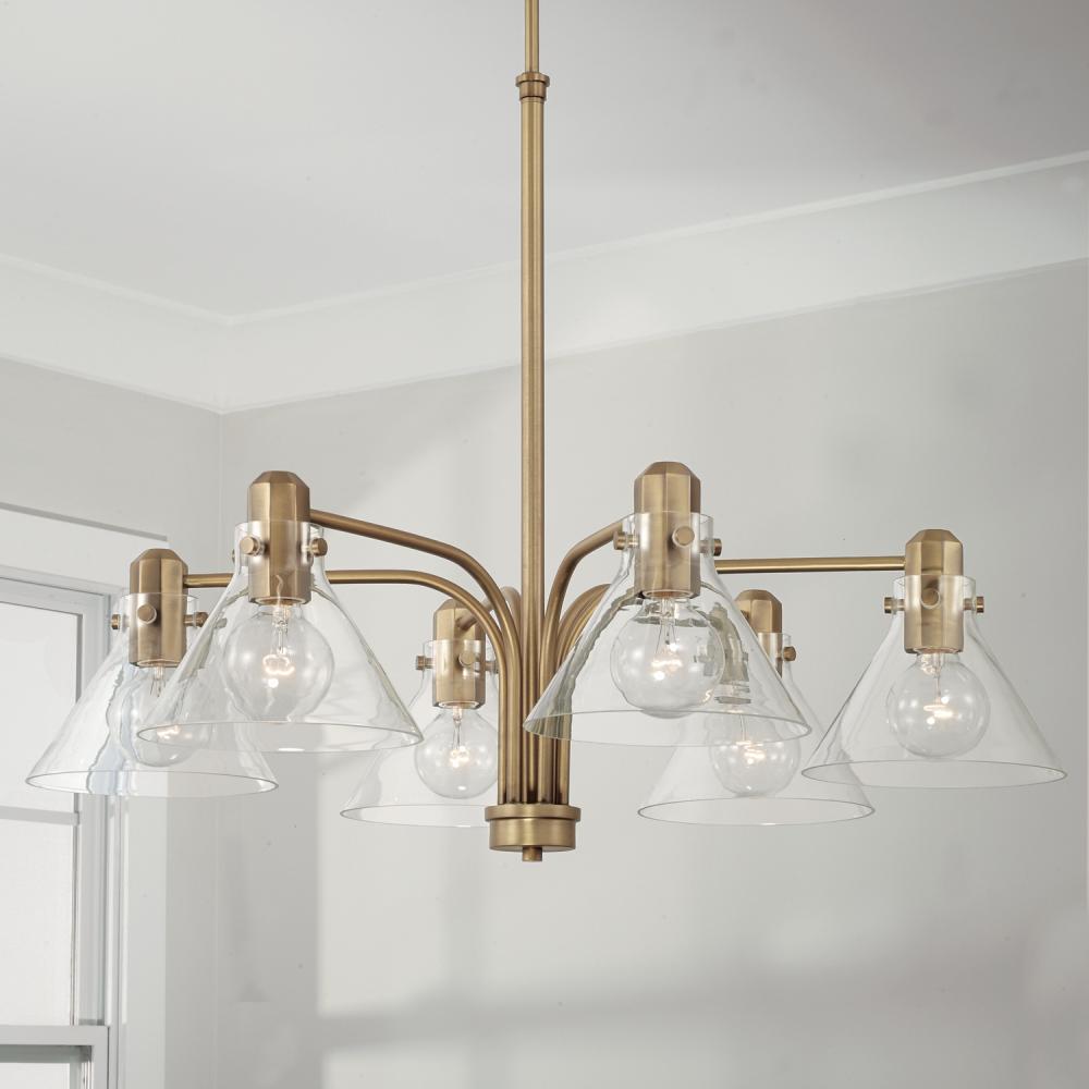 A modern take on midcentury style, the Greer Chandelier brings understated style to any space. The faceted socket and rivet details in Aged Brass adds a pop of personality to the tapered glass.