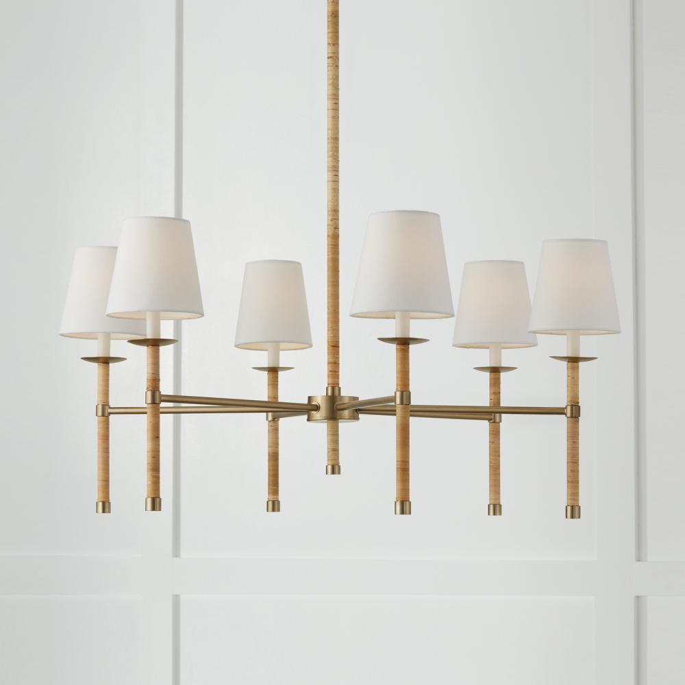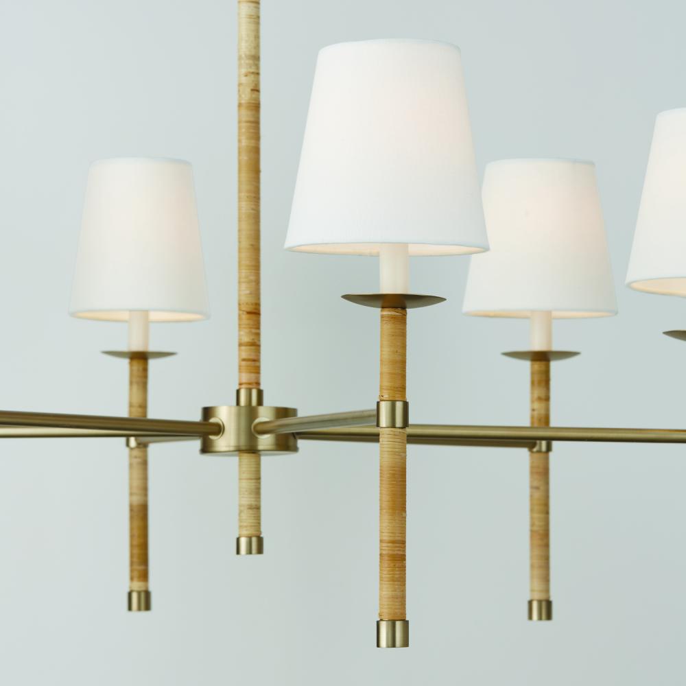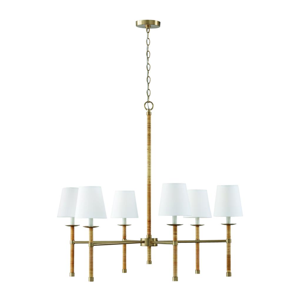 38"W x 35.5"H 6-Light Chandelier in Matte Brass with Hand-Wrapped Natural Rattan and White Fabric Stay-Straight Shade