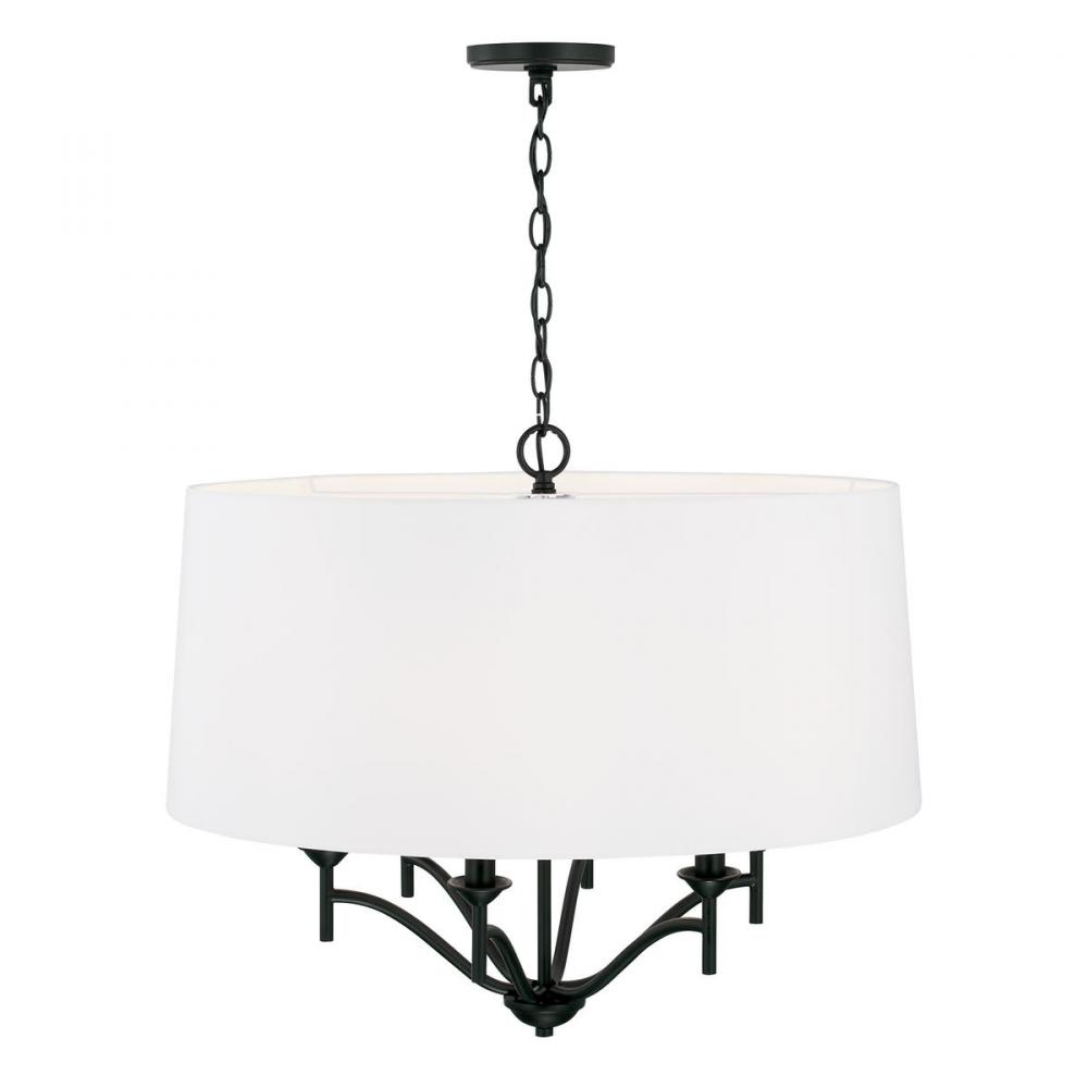 The contrast of the fabric drum shade and the muted tone of the Matte Black finish of the Peyton 6-Light Pendant put a tailored touch on the transitional look. The sharp lines and artistic arches create a timeless look.