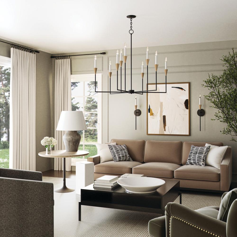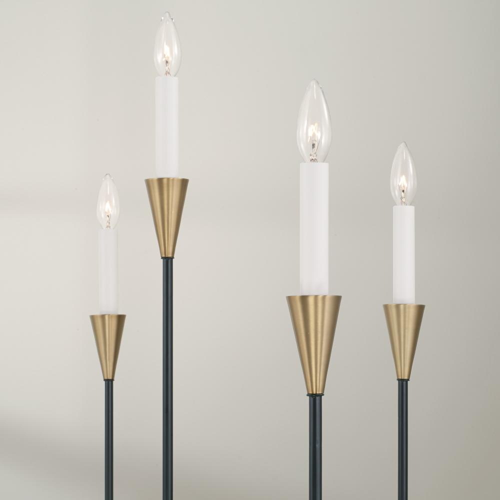 Create striking elegance with the Avant Large Chandelier. The pointed Aged Brass bobeches and squared Matte Black arms evoke a stunning, distinct style, while the interchangeable Aged Brass or Matte White candle sleeves offer a tailor-made feel.