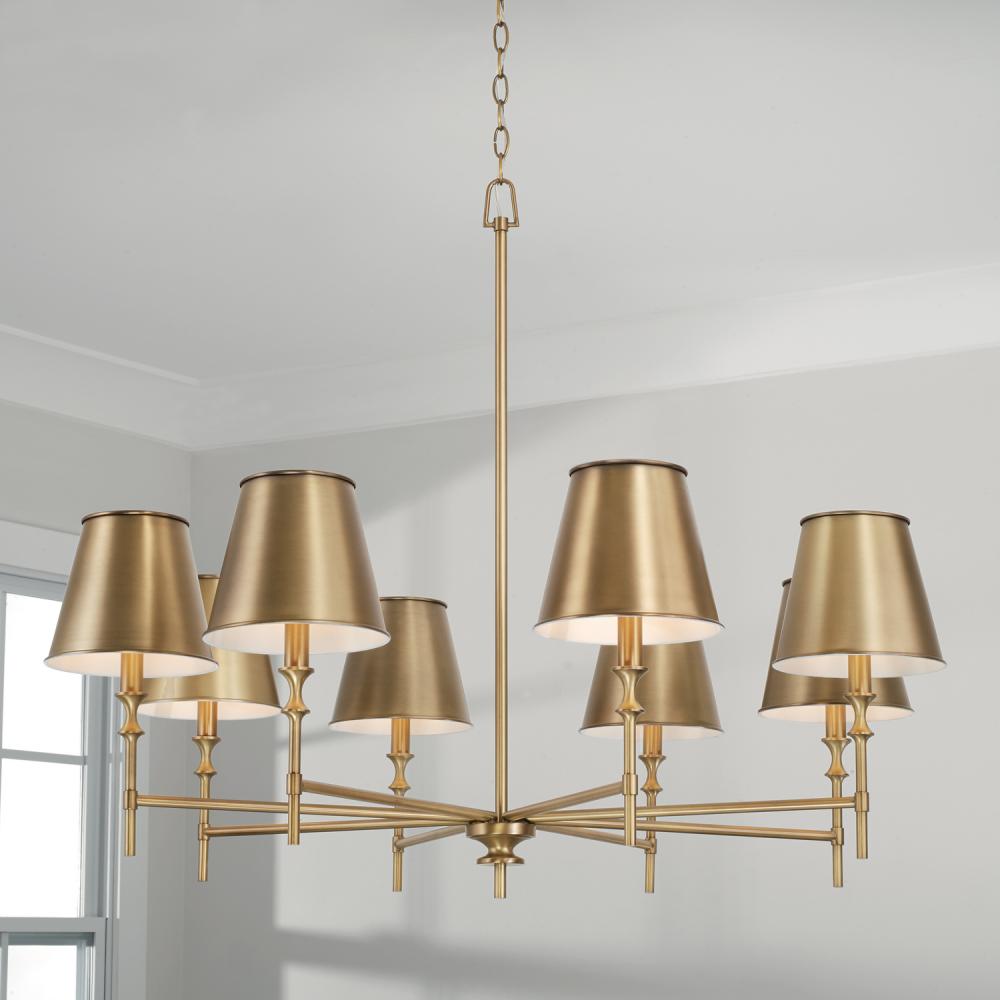 41"W x 33"H 8-Light Chandelier in Aged Brass with Metal Stay-Straight Shade with White Interior
