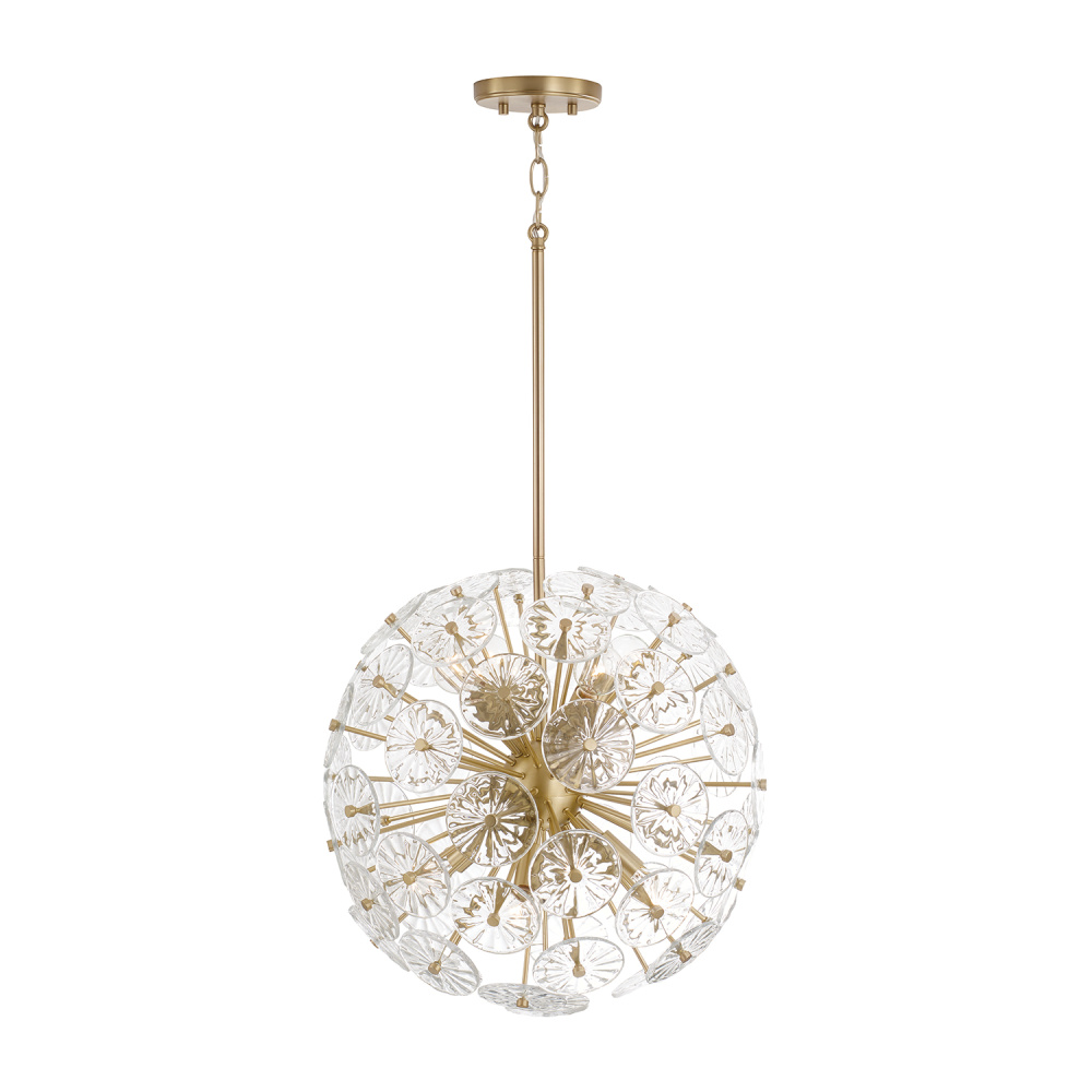 In a starburst of pressed glass petals, the Emelie Pendant creates an effervescent presentation of nature-inspired design. The handcrafted, clear patterned glass offers stunning illumination, perfectly complemented by the Matte Brass stems for gorgeous, statement-making style.